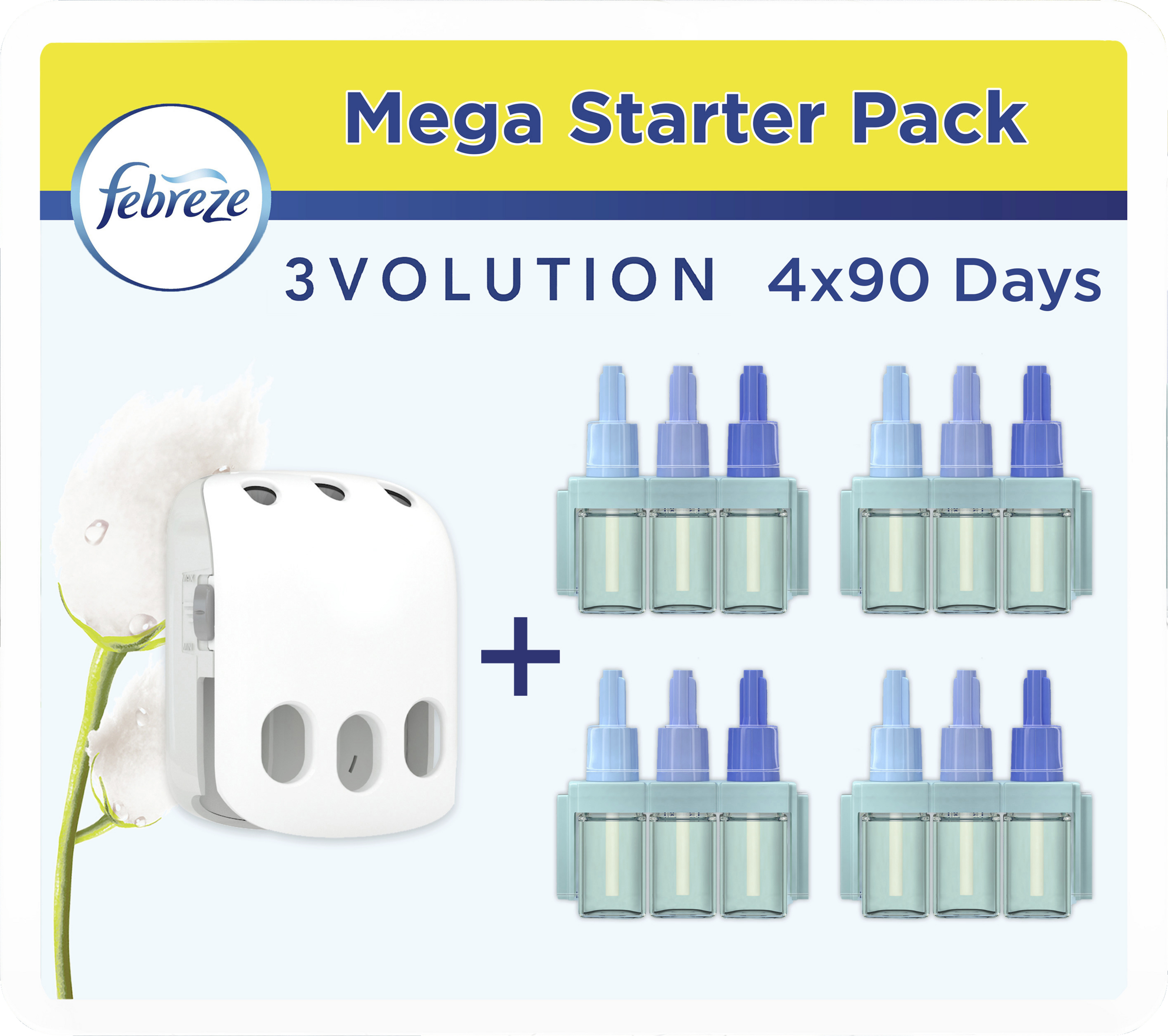 Der Febreze 3Volution Duftstecker Reine Frische mit automatischem Frischeduft-System befreit die Luft kontinuierlich von Gerüchen und wechselt zwischen 3 sich ergänzenden Düften für lang anhaltende Frische bis zu 90 Tage.* Erleben Sie die angenehme Intensität von Reine Frische, mit automatischem Frischeduft-System, die sich im Raum verteilt und ihn mit Duft erfüllt. Der Duft „Reine Frische" ist inspiriert von der Frische reiner weißer Baumwolle. Lassen Sie sich von einem Gefühl der Ruhe vereinnahmen, wenn dieser sanfte Duft den Raum erfüllt. Bei anderen Duftsteckern gewöhnt sich die Nase schnell an den stets gleichen Duft und wird „geruchsblind", so dass der Duft nach einiger Zeit gar nicht mehr wahrgenommen wird. Der Febreze 3Volution Duftstecker löst dieses Problem, da er alle 45 Minuten automatisch zwischen 3 sich ergänzenden, hochwertigen Düften wechselt und damit ein kontinuierliches Frischeerlebnis schafft. Verwenden Sie den Febreze 3Volution Duftstecker nur mit Febreze 3Volution Nachfüllern, um Ihrem Zuhause einen frischen Duft zu verleihen, den Sie Tag für Tag und Woche für Woche wahrnehmen. Mit dem regulierbaren Duftstecker können Sie die Duftintensität so einstellen, wie es Ihnen angenehm erscheint. Damit schaffen Sie ein frisches Ambiente, das Sie 90 Tage* lang genießen können. Erleben Sie die Frische und probieren Sie auch die anderen Febreze Produkte mit der einzigartigen Technologie zur Geruchsbekämpfung aus, z. B. Febreze Textilerfrischer sowie Luft- und Auto Lufterfrischer.