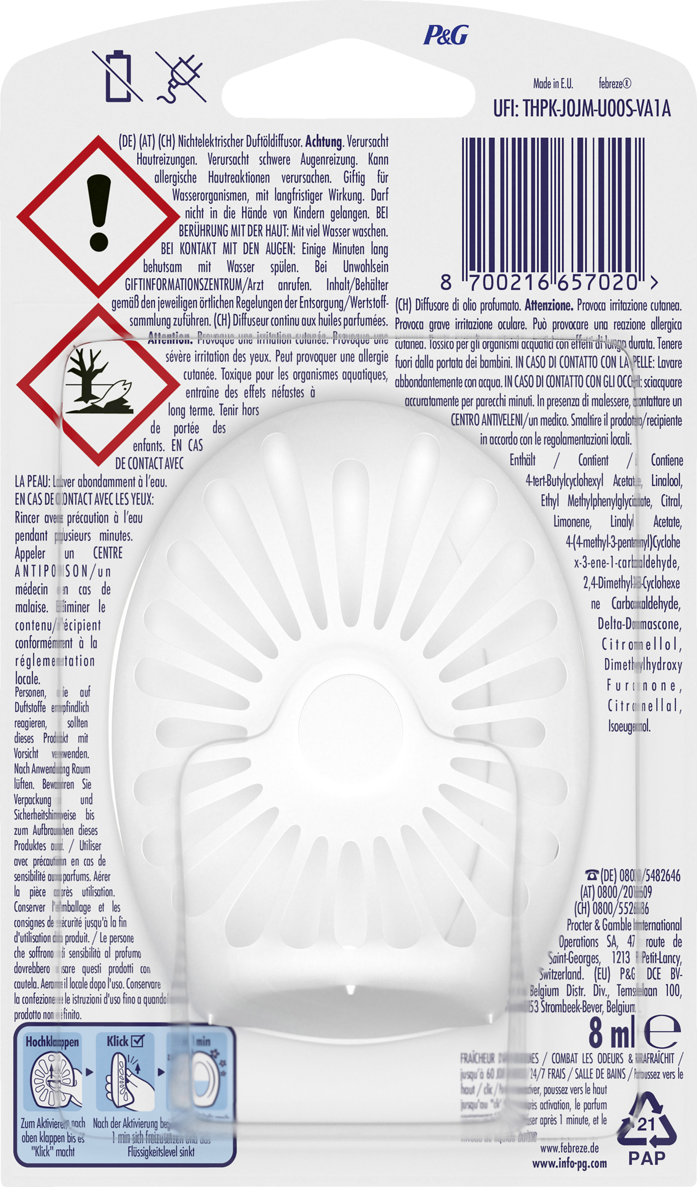 Zum Aktivieren nach oben klappen bis es "Klick" macht. Nach der Aktivierung beginnt der Duft nach 1 min sich freizusetzen und das Flüssigkeitslevel sinkt.