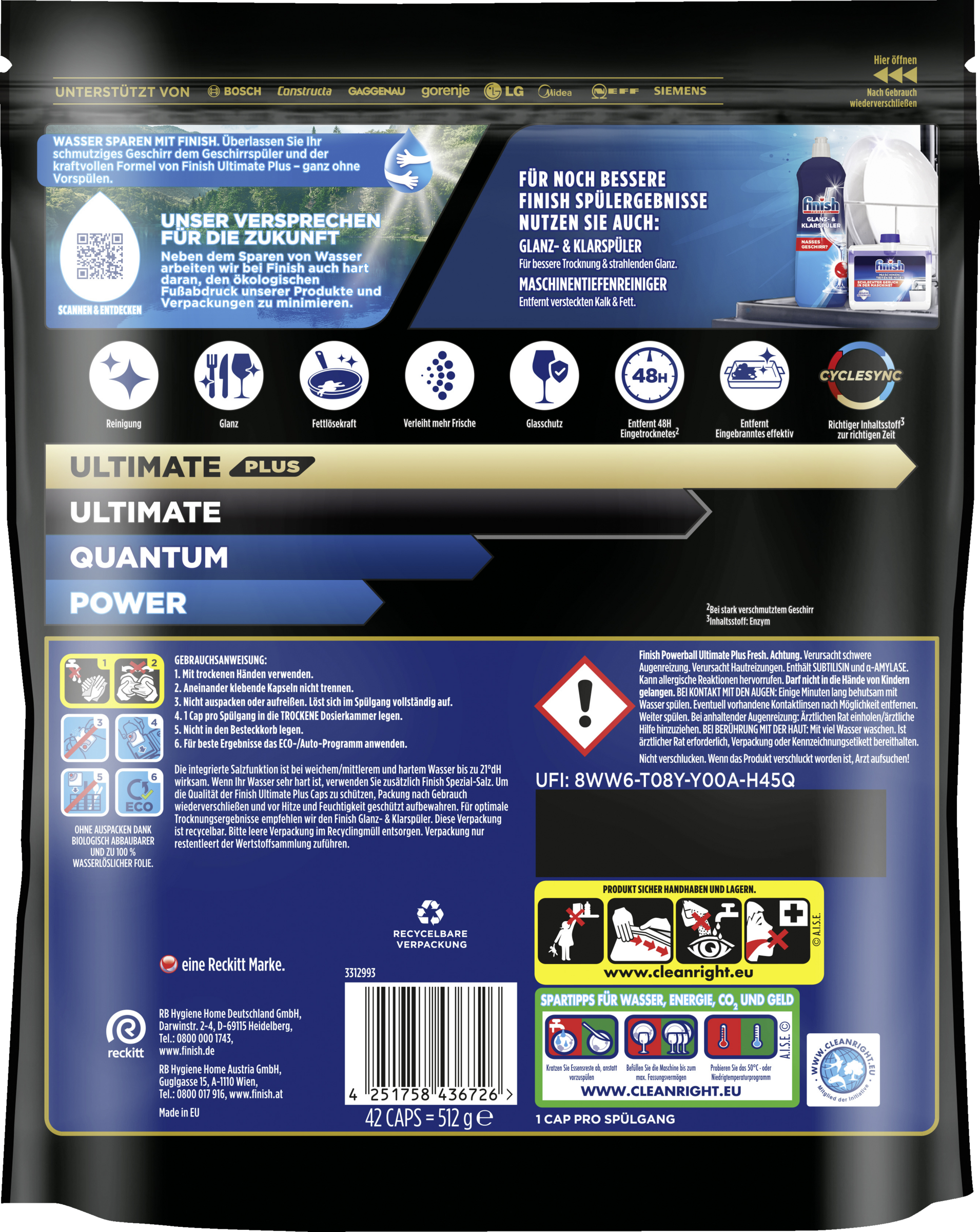 Mit trockenen Händen verwenden. Aneinander klebende Kapseln nicht trennen. Nicht auspacken oder aufreißen. Löst sich im Spülgang vollständig auf. 1 Cap pro Spülgang in die TROCKENE Dosierkammer legen. Nicht in den Besteckkorb legen. Für beste Ergebnisse das ECO-/Auto-Programm anwenden. Die integrierte Salzfunktion ist bei weichem/mittlerem und hartem Wasser bis zu 21°dH wirksam. Wenn Ihr Wasser sehr hart ist, verwenden Sie zusätzlich Finish Spezial-Salz. Um die Qualität der Finish Ultimate Plus Caps zu schützen, Packung nach Gebrauch wiederverschließen und vor Hitze und Feuchtigkeit geschützt aufbewahren. Für optimale Trocknungsergebnisse empfehlen wir den Finish Glanz- & Klarspüler. Diese Verpackung ist recycelbar. Bitte leere Verpackung im Recyclingmüll entsorgen. Verpackung nur restentleert der Wertstoffsammlung zuführen.