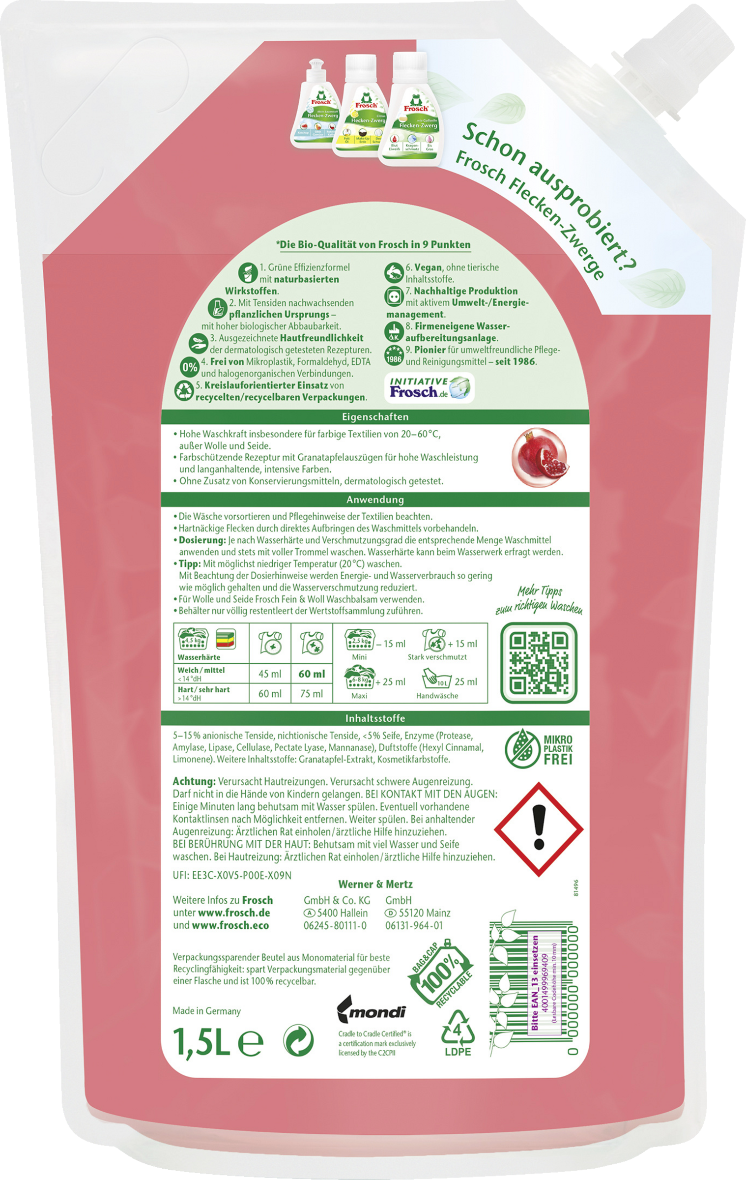 Das Frosch Granatapfel Bunt-Waschmittel eignet sich für alle Textilien, außer Wolle und Seide. Die Rezeptur mit Granatapfelauszügen pflegt die Textilfasern und sorgt bei Temperaturen von 20° bis 60° C für weiche, strahlend reine und angenehm duftende Wäsche. Der spezielle Langzeit-Farbschutz schützt farbige Textilien vor Verblassen und Verfärbung. Das dermatologisch bestätigte Waschmittel ist frei von Farbstoffen und Konservierungsmitteln. Beutel zu 100% recycelbar. Reicht für 25 Waschladungen.