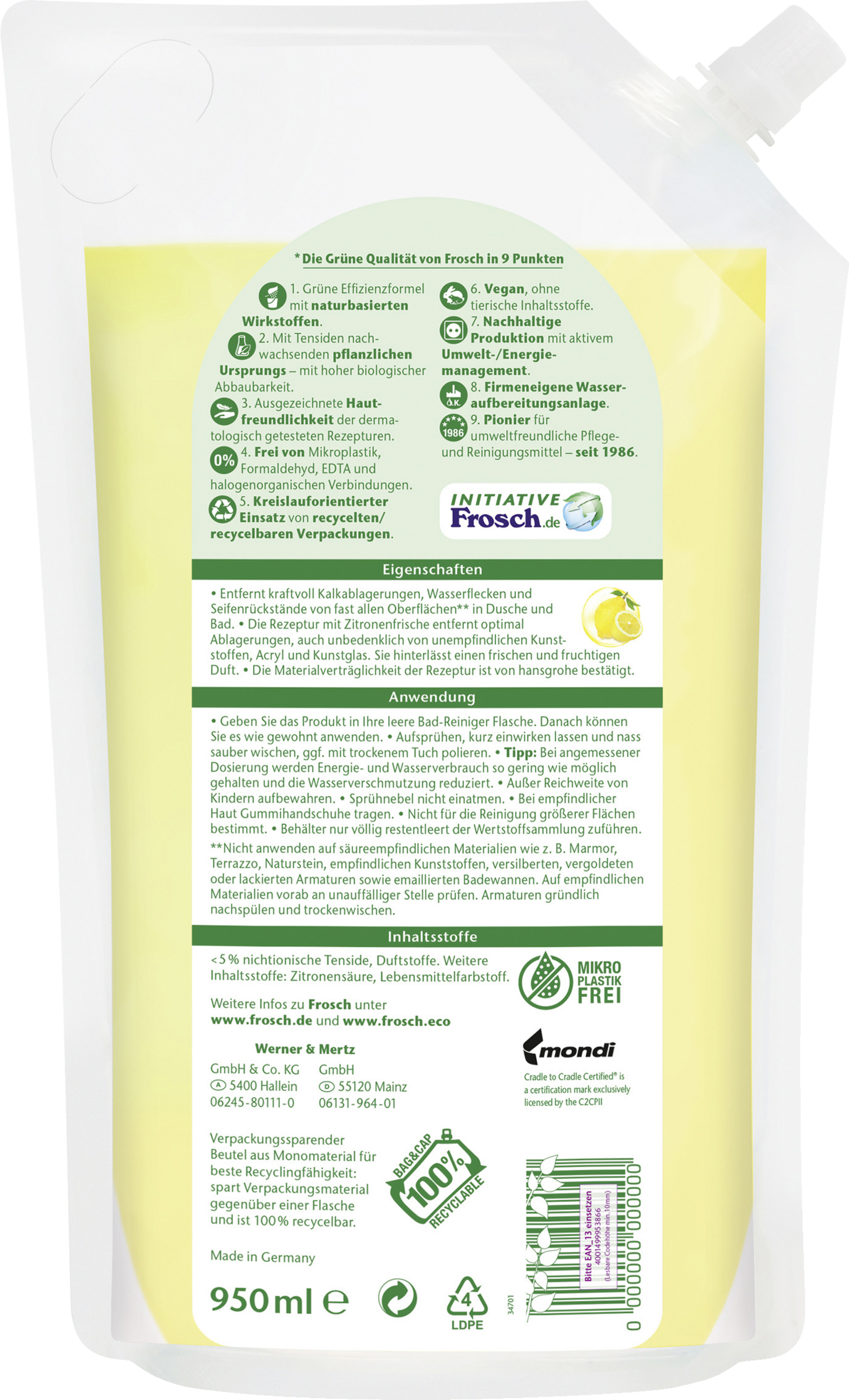 Der Frosch Citrus Dusche & Bad-Reiniger ist ein kraftvoller Reiniger für Dusche und Badezimmer, der dank seiner Rezeptur mit natürlichen Säuren der Zitrone die optimale Entfernung von Kalk, Wasserflecken, Seifenresten und Schmutzablagerungen gewährleistet. Gleichzeitig beseitigt er unangenehme Gerüche und hinterlässt einen frisch-fruchtigen Duft in Ihrem Badezimmer.