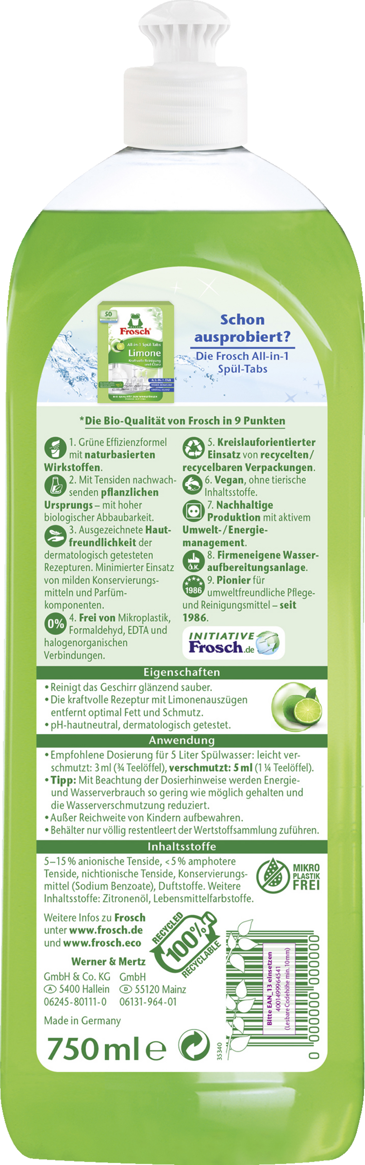 Das Frosch Limone Spülmittel reinigt das Geschirr glänzend sauber. Die Rezeptur auf Basis pflanzlicher Tenside sorgt für die optimale Fett- und Schmutzlösekraft und hinterlässt einen angenehm frischen Limonenduft. Das Spülmittel ist pH-hautneutral ausgerichtet, seine sehr gute Hautverträglichkeit wurde dermatologisch bestätigt.