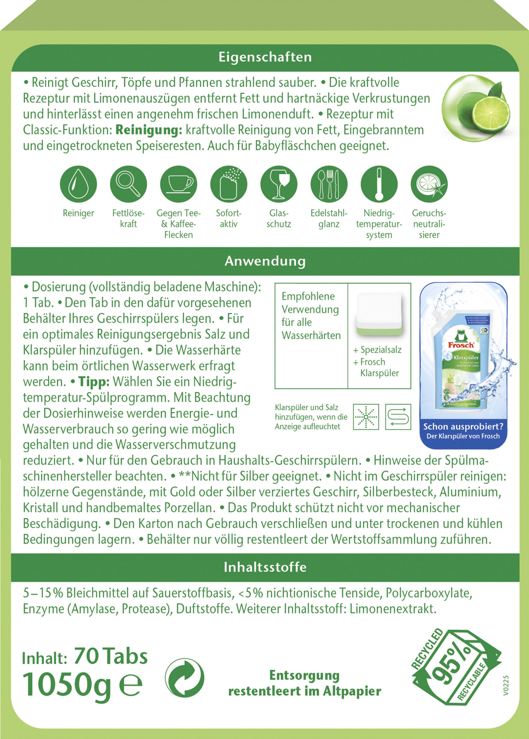 - Dosierung: 1 Tab = 1 Spülgang