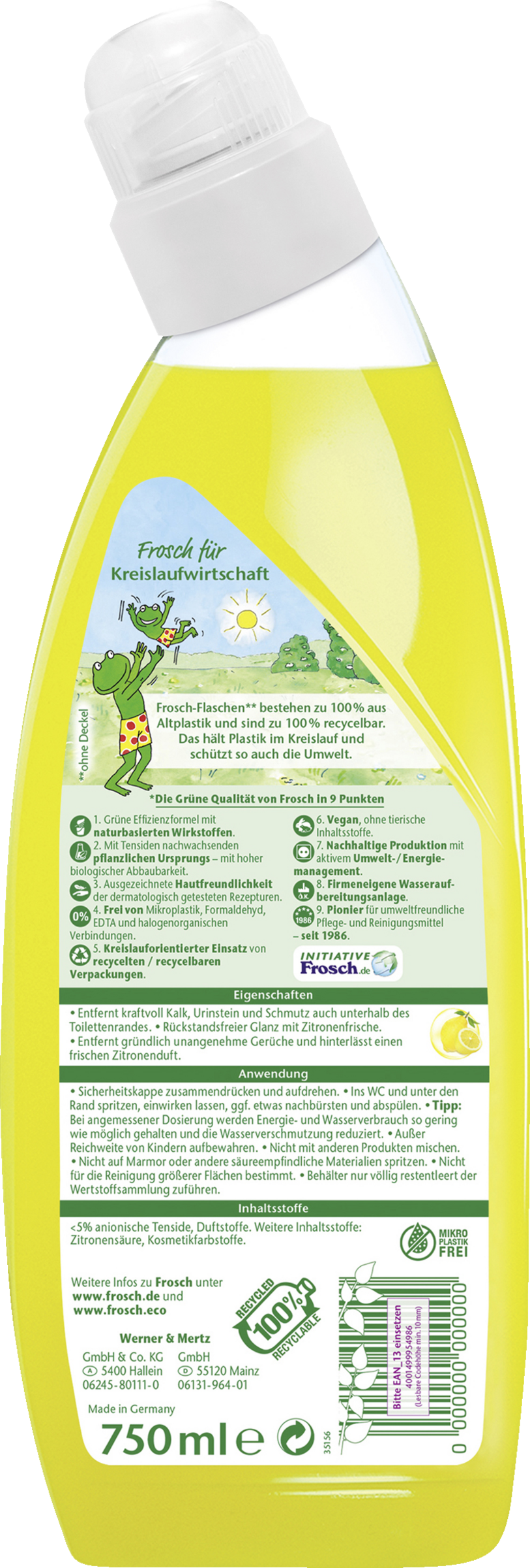 Der Frosch Zitronen WC-Reiniger entfernt dank seiner leistungsstarken Rezeptur mit Zitronensäure, Kalk, Urinstein und Schmutz sogar bis unter den WC-Rand. Gleichzeitig bekämpft der WC-Reiniger unangenehme Gerüche und hinterlässt einen angenehm frischen Zitronenduft im WC.