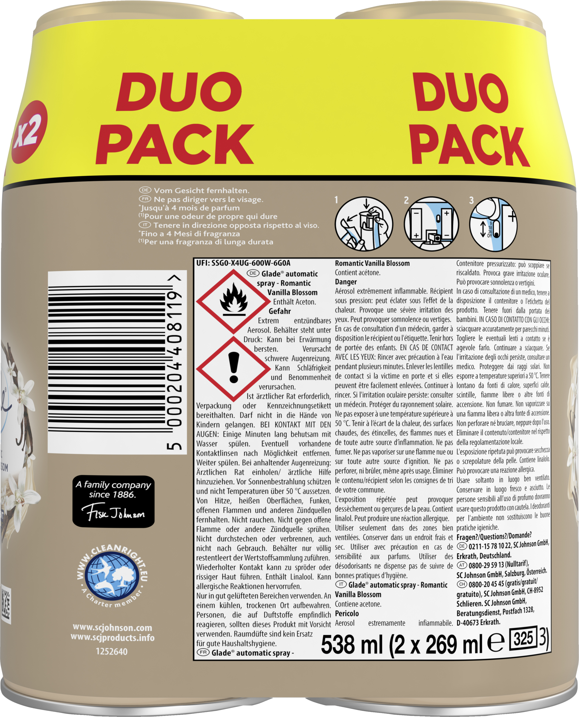 - Duftbehälter einfüllen: Gerät öffnen. Rote Lasche herausziehen, um Batterien zu aktivieren. Kappe von Duftbehälter abnehmen und ihn mit nach vorne gerichtetem Sprayaufsatz einlegen. Gewünschte Zeit in Minuten einstellen, um Gerät einzuschalten. Gerät schließen. Im eingestellten Zeitintervall erfolgt ein Sprühstrahl. Bei Bedarf per Druck auf den Knopf an der Geräterückseite einen weiteren Sprühstrahl Glade® Duft auslösen.
