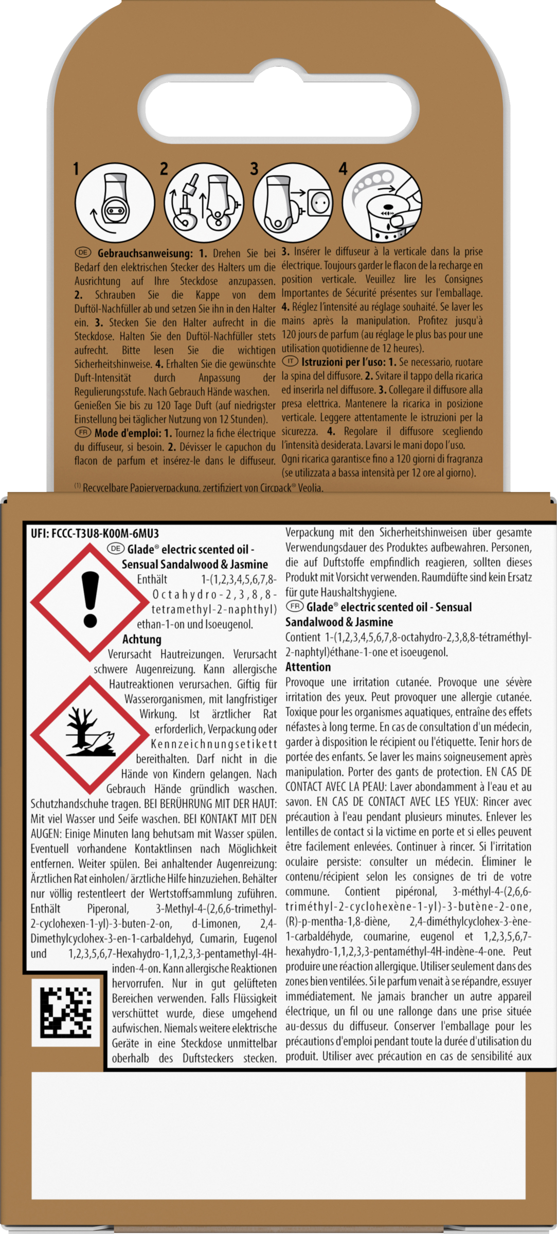 Enthält 1-(1,2,3,4,5,6,7,8-Octahydro-2,3,8,8-tetramethyl-2-naphtyhl) ethan-1-on und Isoeugenol. Verursacht Hautreizungen. Verursacht schwere Augenreizung. Kann allergische Hautreaktionen verursachen. Giftig für Wasserorganismen, mit langfristiger Wirkung. Ist ärztlicher Rat erforderlich, Verpackung oder Kennzeichnungsetikett bereithalten. Darf nicht in die Hände von Kindern gelangen. Nach Gebrauch Hände gründlich waschen. Schutzhandschuhe tragen. Bei Berührung mit der Haut: Mit viel Wassr und Seife waschen. Bei Kontakt mit den Augen: Einige Minuten lang behutsam mit Wasser spülen. Eventuell vorhandene Kontaktlinsen nach Möglichkeit entfernen. Weiter Spülen. Bei anhaltender Augenreizung: Ärztlichen Rat/ärztliche Hilfe hinzuziehen. Behälter nur völlig restentleert der Wertstoffsammlung zuführen. Enthält Piperonal, 3-Methyl-4-(2,6,6-trimethyl-2-cyclohexen-1-yl)-3-buten-2-on, d-Limonen, 2,4-Dimethylcyclohex-3-en-1-carbaldehyd, Cumarin, Eugenol und 1,2,3,5,6,7-Hexahydro-1,1,2,3,3-pentamethyl-4H-inden-4-on. Kann allergische Reaktionen hervorrufen. Nur in gut gelüfteten Bereichen verwenden. Falls Flüssigkeit verschüttet wurde, diese umgehend aufwischen. Niemals weitere elektrische Geräte in eine Steckdose unmittelbar oberhalb des Duftsteckers stecken. Verpackung mit den Sicherheitshinweisen über gesamte Verwendungsdauer des Produktes aufbewahren. Personen die auf Duftstoffe empfindlich reagieren, sollten dieses Produkt mit Vorsicht verwenden. Raumdüfte sind kein Ersatz für gute Haushaltshygiene.Enthält Benzaldehyd, Citral d-Limonen und dentha arvensis Öl. Kann allergische Reaktionen hervorrufen. Verpackung mit den Sicherheitshinweisen über gesamte Verwendungsdauer des Produktes aufbewahren. Nur in gut gelüfteten Bereichen verwenden. Falls Flüssigkeit verschüttet wurde, diese umgehend aufwischen. Niemals weitere elektrische Geräte in eine Steckdose unmittelbar oberhalb des Duftsteckers stecken. Personen, die auf Duftstoffe empfindlich reagieren, sollten dieses Produkt mit Vorsicht verwenden. Raumdüfte sind kein Ersatz für gute Haushaltshygiene.Nur in gut gelüfteten Bereichen verwenden. Falls Flüssigkeit verschüttet wurde, diese umgehend aufwischen. Niemals weitere elektrische Geräte in eine Steckdose unmittelbar oberhalb des Duftsteckers stecken. Verpackung mit den Sicherheitshinweisen über gesamte Verwendungsdauer des Produktes aufbewahren. Personen, die auf Duftstoffe empfindlich reagieren, sollten dieses Produkt mit Vorsicht verwenden. Raumdüfte sind kein Ersatz für gute Haushaltshygiene. Enthält Piperonal 3-Methyl-4-(2,6,6-trimethyl-2-cyclohexen-1-yl)-3-buten-2-on d-Limonen 2,4-Dimethylcyclohex-3-en-1-carbaldehyd Cumarin Eugenol 1,2,3,5,6,7-Hexahydro-1,1,2,3,3-pentamethyl-4H-inden-4-on Kann allergische Reaktionen hervorrufen.
