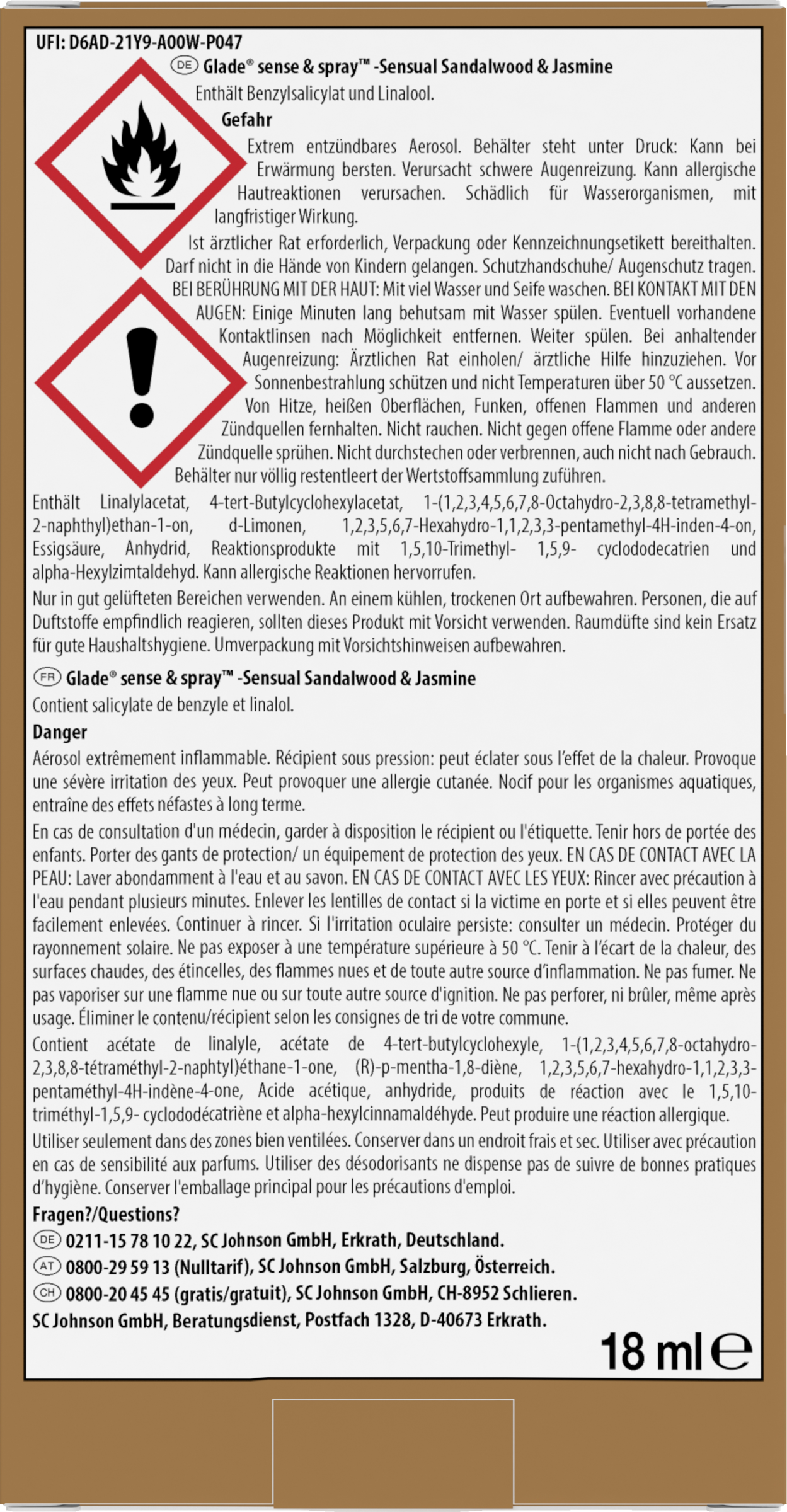 Enthält: Benzylsalicylat,4-tert-Butylcyclohexylacetat, 1-(1,2,3,4,5,6,7,8-Octahydro-2,3,8,8-tetramethyl-2-naphthyl)ethan-1-on, d-Limonen, Linalool, alpha-Hexylzimtaldehyd.