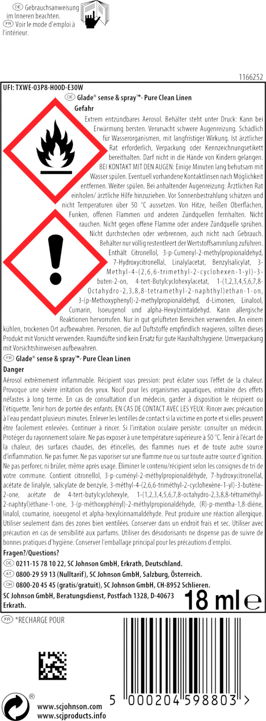 Extrem entzündbares Aerosol. Behälter steht unter Druck: Kann bei Erwärmung bersten. Schädlich für Wasserorganismen, mit langfristiger Wirkung. Darf nicht in die Hände von Kindern gelangen. Ist ärztlicher Rat erforderlich, Verpackung oder Kennzeichnungsetikett bereithalten. BEI KONTAKT MIT DEN AUGEN: Einige Minuten lang behutsam mit Wasser spülen. Vorhandene Kontaktlinsen nach Möglichkeit entfernen. Weiter spülen. Vor Sonnenbestrahlung schützen. Nicht Temperaturen über 50° C aussetzen. Von Hitze, heißen Oberflächen, Funken, offenen Flammen und anderen Zündquellen fernhalten. Nicht rauchen. Nicht gegen offene Flammen oder andere Zündquelle sprühen. Nicht durchstechen oder verbrennen, auch nicht nach Gebrauch. Aerosol nicht einatmen. Achtung: Anwendung nur nach Gebrauchsanweisung. Nur in gut gelüfteten Bereichen verwenden. Personen, die auf Duftstoffe empfindlich reagieren, sollten dieses Produkt mit Vorsicht verwenden. Raumdüfte sind kein Ersatz für gute Haushaltshygiene. Enthält Hexylsalicylat. Kann allergische Reaktionen hervorrufen. Behälter nur völlig restentleert der Wertstoffsammlung zuführen. Teilentleerten Behälter der Problemabfallentsorgung zuführen.