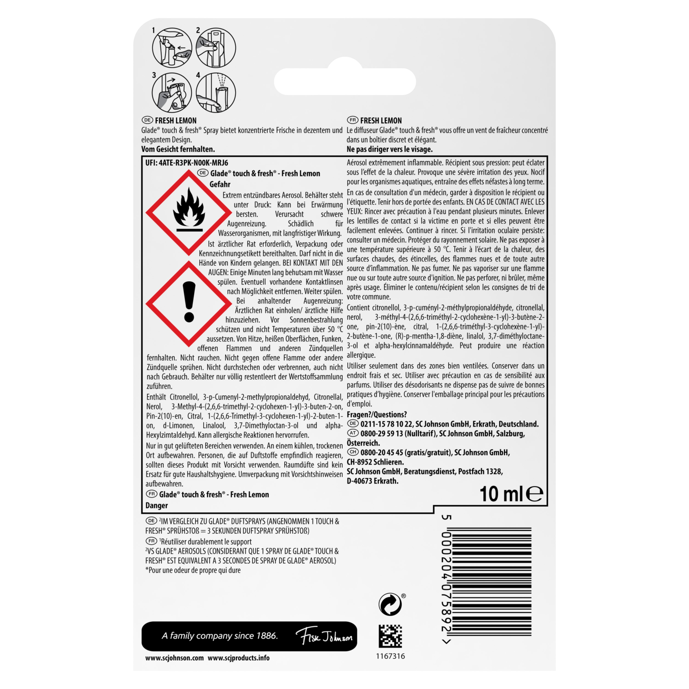 Glade® Touch & Fresh® liefert einen sofortigen Frischeschub, wann immer Sie ihn benötigen. Einfach drücken, um den leisen, zarten Nebel zu aktivieren und Ihr Badezimmer schnell mit Duft zu erfüllen. Die diskrete Größe und die konzentrierte Formel sorgen dafür, dass Ihr Badezimmer immer einladend wirkt. Dies gibt Ihnen Sicherheit, die nur einen Tastendruck entfernt ist. Mit nur einer Berührung erhalten Sie 10 Mal mehr Frische (verglichen mit Glade® Duftspray), so dass Sie sich sofort wieder in Ihrem Badezimmer wohlfühlen. Zudem hinterlässt Glade® Touch & Fresh® keine lästigen Rückstände auf Oberflächen dank des feinen, sanften Sprühnebels mit 50-fach leichteren Dufttröpchen. Sie können Ihren Glade® Touch & Fresh® Halter wie gewohnt an der Wand befestigen, nach Belieben aus der Wandhalterung rausnehmen oder ihn flexibel auf einer von Ihnen gewünschten Oberfläche hinstellen. Zusätzlich ermöglicht Ihnen unser modernes Design, Ihr Badezimmer zu erfrischen, ohne dabei die Ästhetik Ihres Hauses zu beeinträchtigen. Zelebrieren Sie den anregenden Duft von Zitrus, wenn sich Noten von spritziger Clementine, goldener Mandarine und frischer Zitrone in einem Hauch von fruchtigem Pfirsich und taufrischer Zyklame vereinen. Der Duft von weißem Moschus verweilt spielerisch und rundet diesen saftig-frischen Duft perfekt ab.