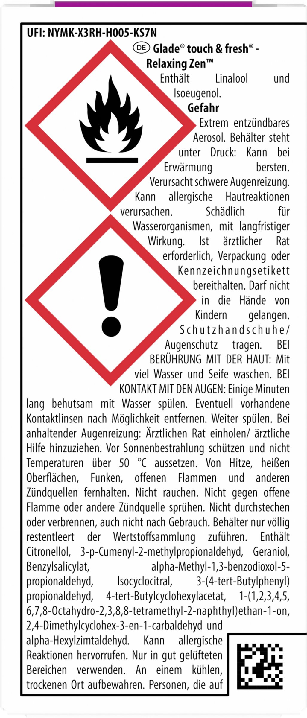 Extrem entzündbares Aerosol. Behälter steht unter Druck: Kann bei Erwärmung bersten.Kann allergische Hautreaktionen verursachen. Schädlich für Wasserorganismen, mit langfristiger Wirkung. Ist ärztlicher Rat erforderlich, Verpackung oder Kennzeichnungsetikett bereithalten. Darf nicht in die Hände von Kindern gelangen. BEI BERÜHRUNG MIT DER HAUT: Mit viel Wasser und Seife waschen. Bei Hautreizung oder -ausschlag: Ärztlichen Rat einholen/ ärztliche Hilfe hinzuziehen. BEI KONTAKT MIT DEN AUGEN: Einige Minuten lang behutsam mit Wasser spülen. Eventuell vorhandene Kontaktlinsen nach Möglichkeit entfernen. Weiter spülen. Bei anhaltender Augenreizung: Ärztlichen Rat einholen/ ärztliche Hilfe hinzuziehen.Vor Sonnenbestrahlung schützen. Nicht Temperaturen über 50 °C/122 °F aussetzen. Behälter nur völlig restentleert der Wertstoffsammlung zuführen. Von Hitze, heißen Oberflächen, Funken, offenen Flammen und anderen Zündquellen fernhalten. Nicht rauchen. Nicht gegen offene Flamme oder andere Zündquelle sprühen. Nicht durchstechen oder verbrennen, auch nicht nach Gebrauch. Schutzhandschuhe tragen. Einatmen von Aerosol vermeiden.