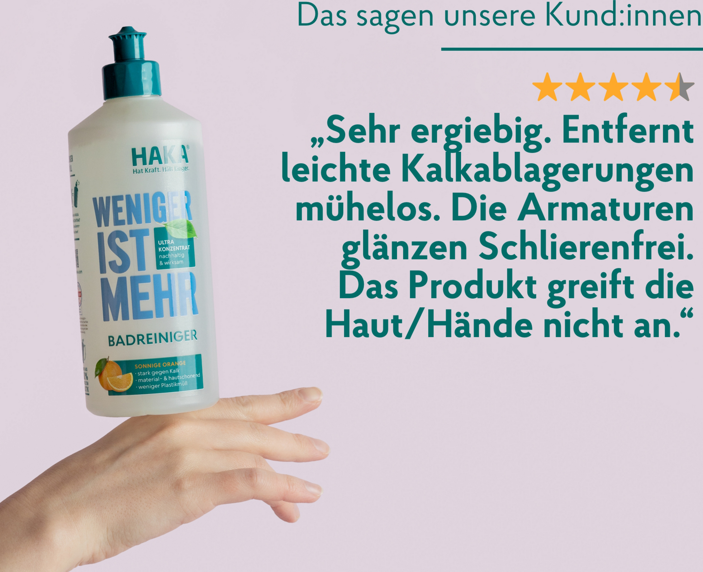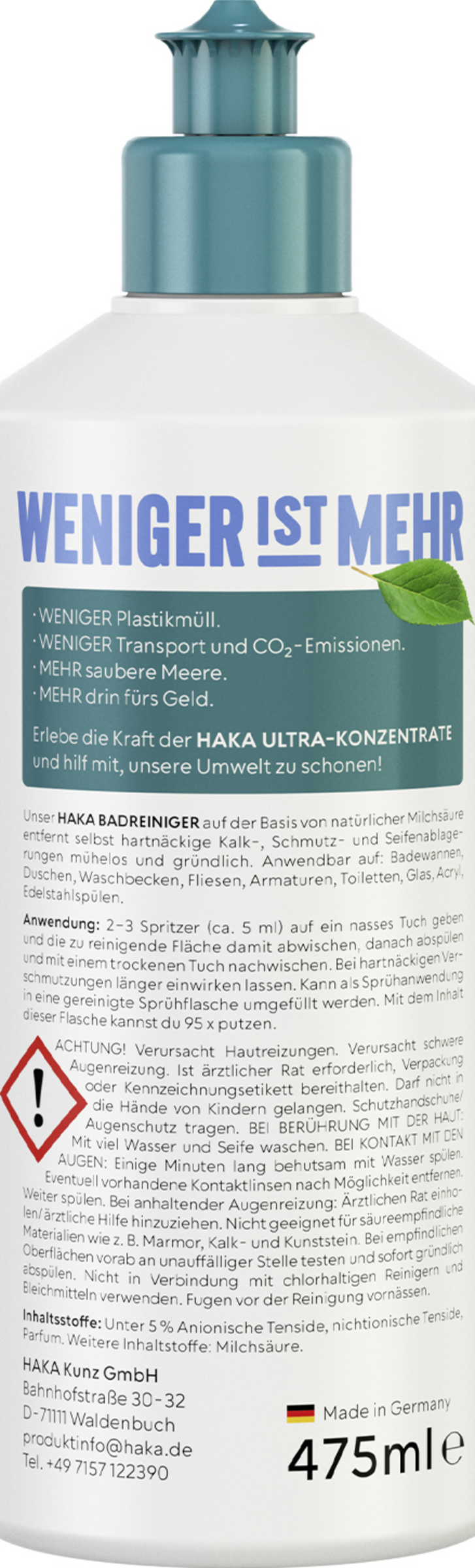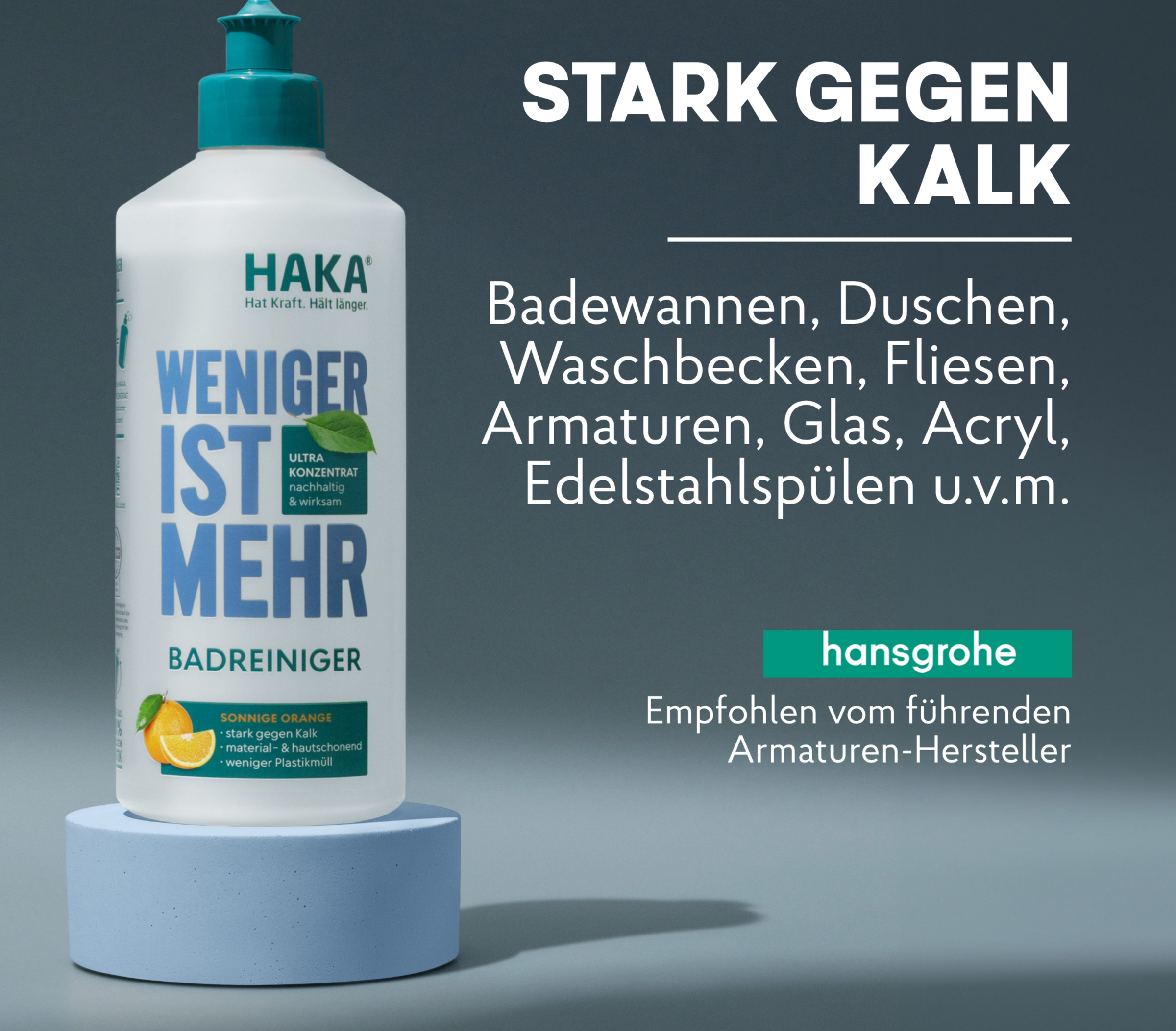 Der HAKA Badreiniger auf der Basis von natürlicher Milchsäure entfernt selbst hartnäckige Kalk-, Schmutz- und Seifenablagerungen mühlelos und gründlich. Anwendbar auf Badewannen, Duschen, Waschbecken, Fliesen, Armaturen, Toiletten, Glas, Acryl, Edelstahlspülen.