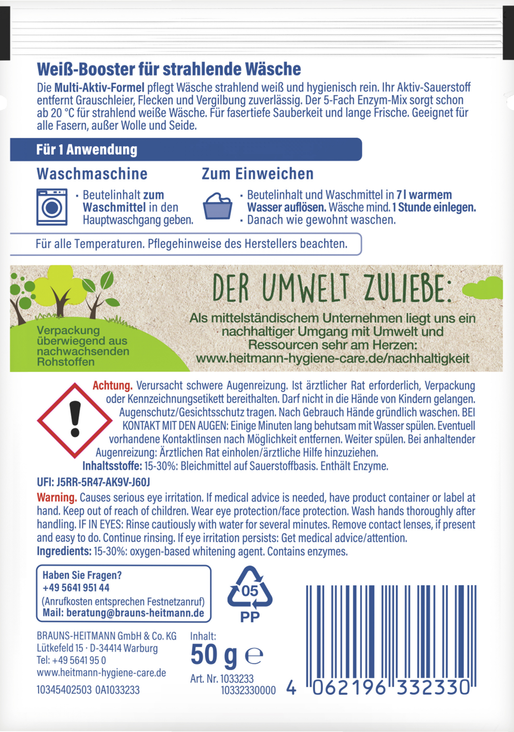 - Zum Einweichen: Beutelinhalt und Waschmittel in 7 l warmem Wasser auflösen. Wäsche mind. 1 Stunde einlegen. Danach wie gewohnt waschen.