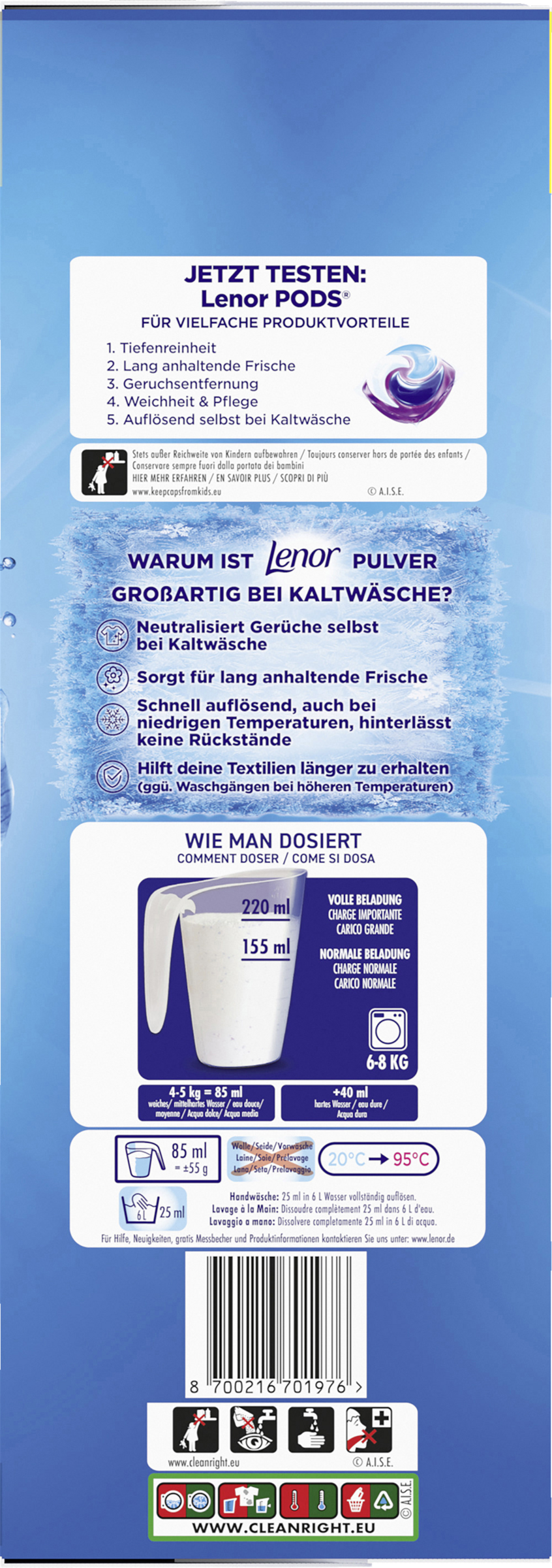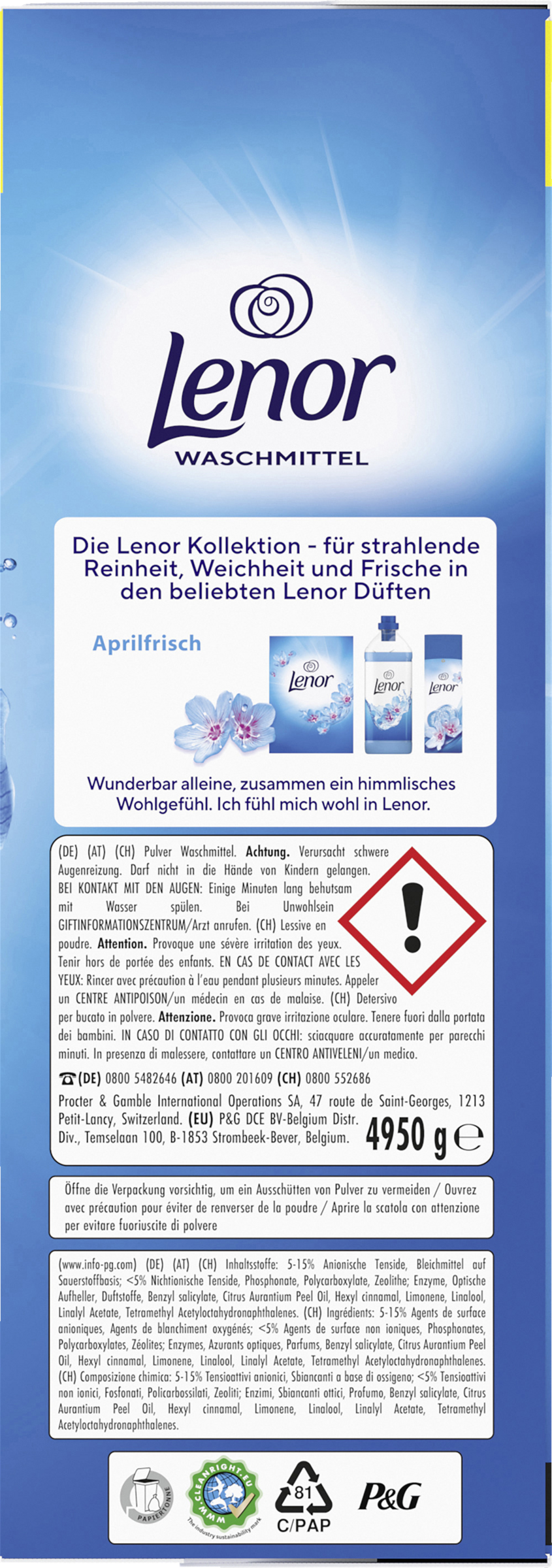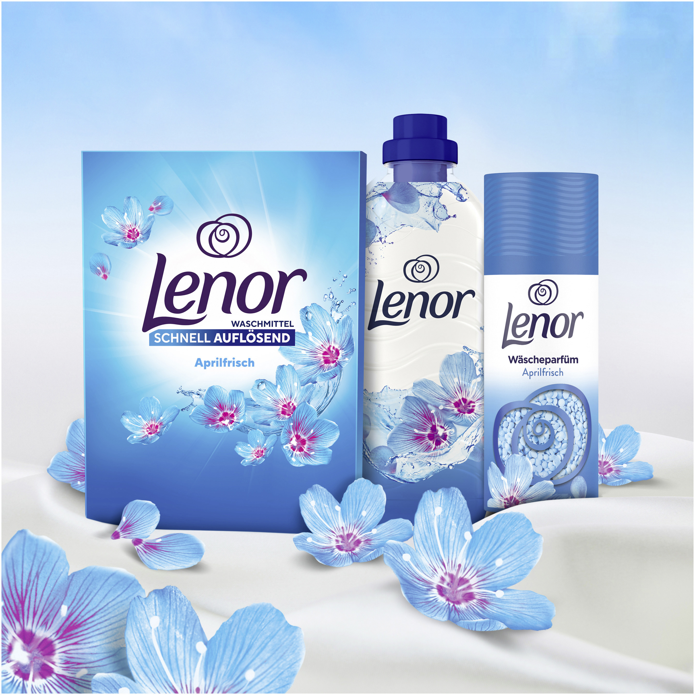 Testen Sie das SCHNELL AUFLÖSENDE LENOR Aprilfrisch Waschpulver mit 2-mal länger anhaltende Frische (im Vergleich zu Ariel Universal+ bei Lagerung im Schrank) und Geruchsentfernung selbst bei niedrigen Temperaturen. Mit seiner schnell auflösenden Formel, die bei Wasserkontakt sofort aktiv wird, sorgt Lenor für tiefenwirksame Reinheit, selbst bei niedrigen Temperaturen. Darüber hinaus verhindert es Pulverrückstände. In Kombination mit Lenor Aprilfrisch Weichspüler und Wäscheparfüm für tiefenwirksame Reinheit, Weichheit und Frische verwenden. Ein wahrer Genuss! Ich fühl mich wohl in Lenor!