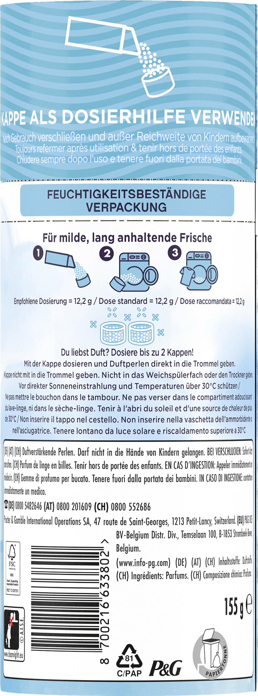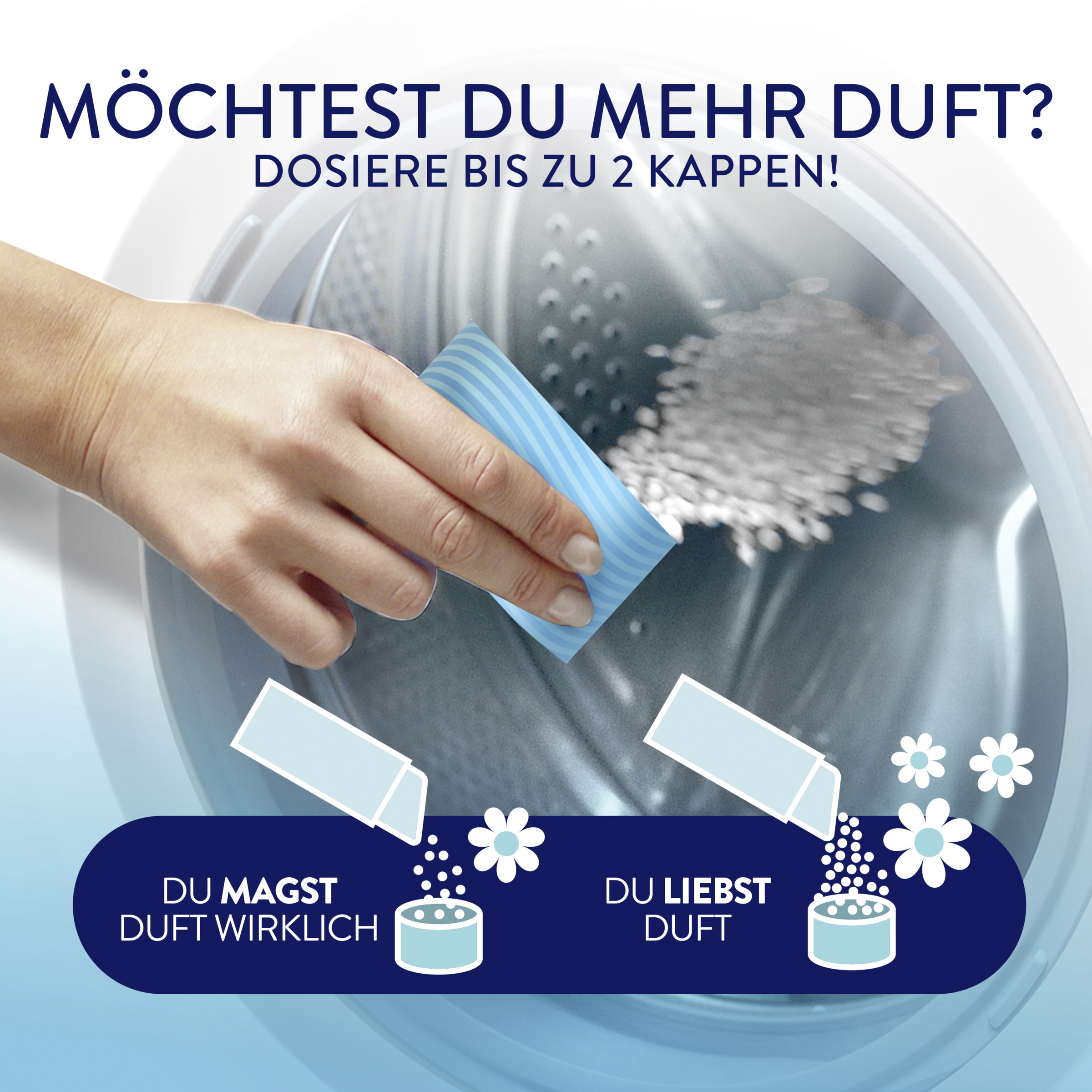 KAPPE ALS DOSIERHILFE VERWENDEN. Nach Gebrauch verschließen. Empfohlene Dosierung = 12,2 g. Mit der Kappe dosieren und Duftperlen direkt in die Trommel geben. Kappe nicht mit in die Trommel geben. Nicht in das Weichspülerfach oder den Trockner geben.