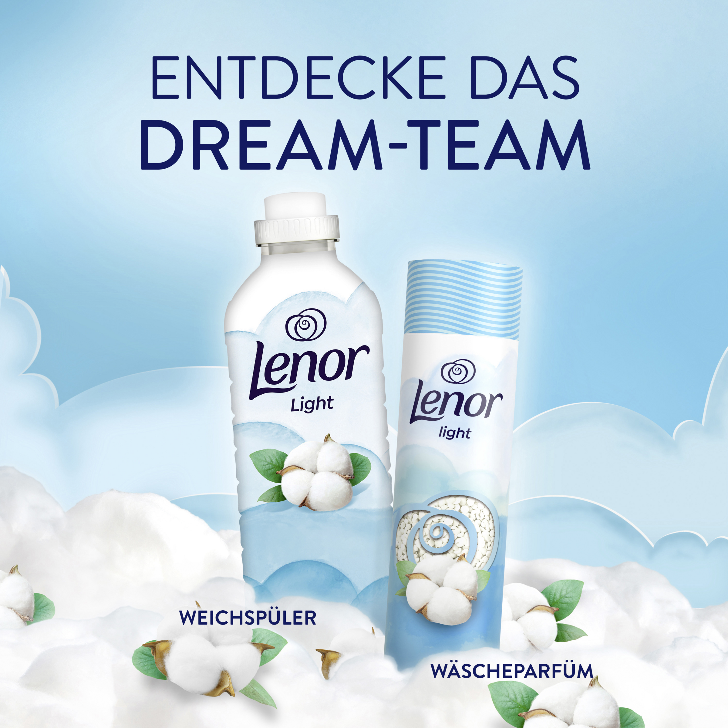 Verleihe deiner Wäsche mit dem Lenor Light Wäscheparfüm Frische Baumwollblüte milde Frische, die lange anhält. Es enthält 0 % Farbstoffe und ist dermatologisch getestet. Mit einem leichten, frischen Duft zarter Baumwollblüte. Kombiniere das Lenor Light Wäscheparfüm mit dem passendem Lenor Light Weichspüler - beide sind perfekt aufeinander abgestimmt und sorgen für unwiderstehliche und sanfte Frische.