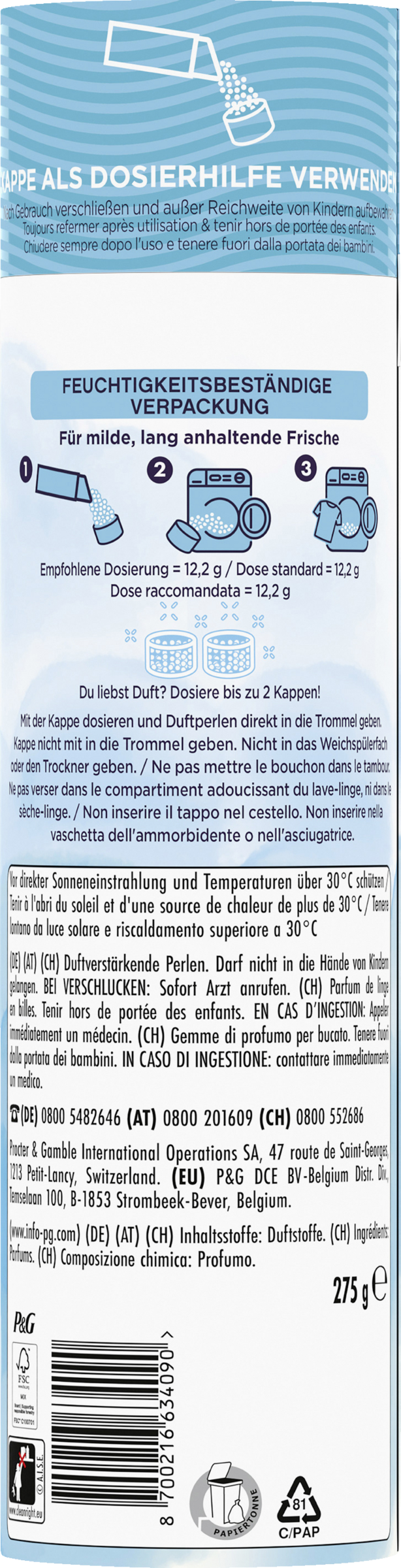 KAPPE ALS DOSIERHILFE VERWENDEN. Nach Gebrauch verschließen und außer Reichweite von Kindern aufbewahren. Empfohlene Dosierung = 12,2 g. Mit der Kappe dosieren und Duftperlen direkt in die Trommel geben. Kappe nicht mit in die Trommel geben. Nicht in das Weichspülerfach oder den Trockner geben. Vor direkter Sonneneinstrahlung und Temperaturen über 30°C schützen.