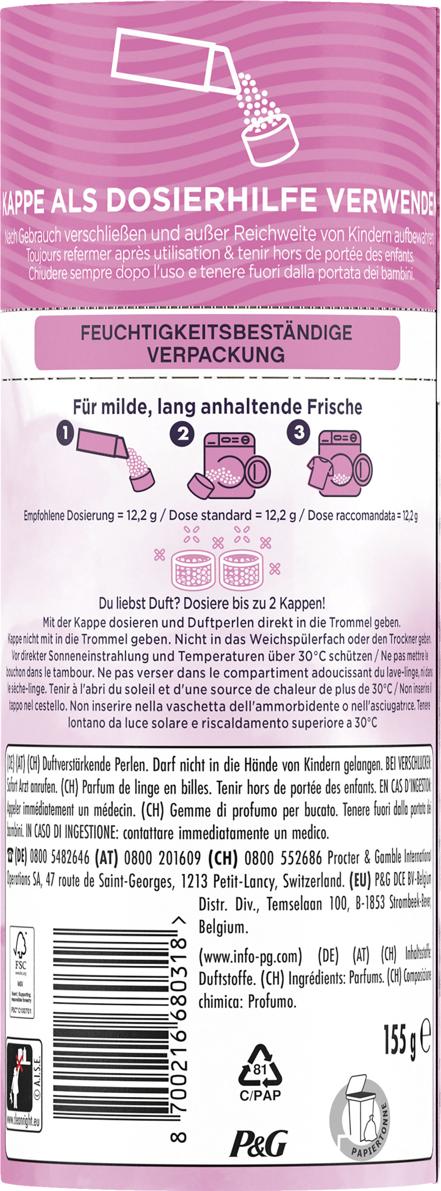 KAPPE ALS DOSIERHILFE VERWENDEN. Nach Gebrauch verschließen. Empfohlene Dosierung = 12,2 g. Mit der Kappe dosieren und Duftperlen direkt in die Trommel geben. Kappe nicht mit in die Trommel geben. Nicht in das Weichspülerfach oder den Trockner geben.
