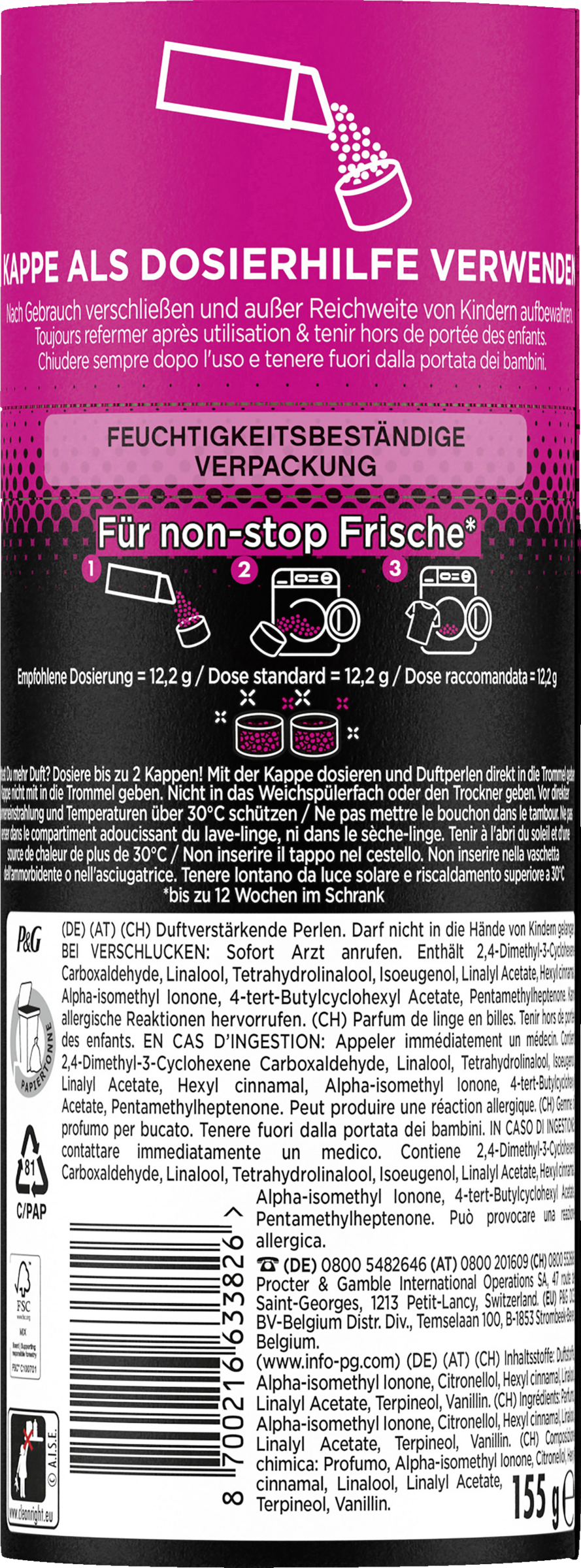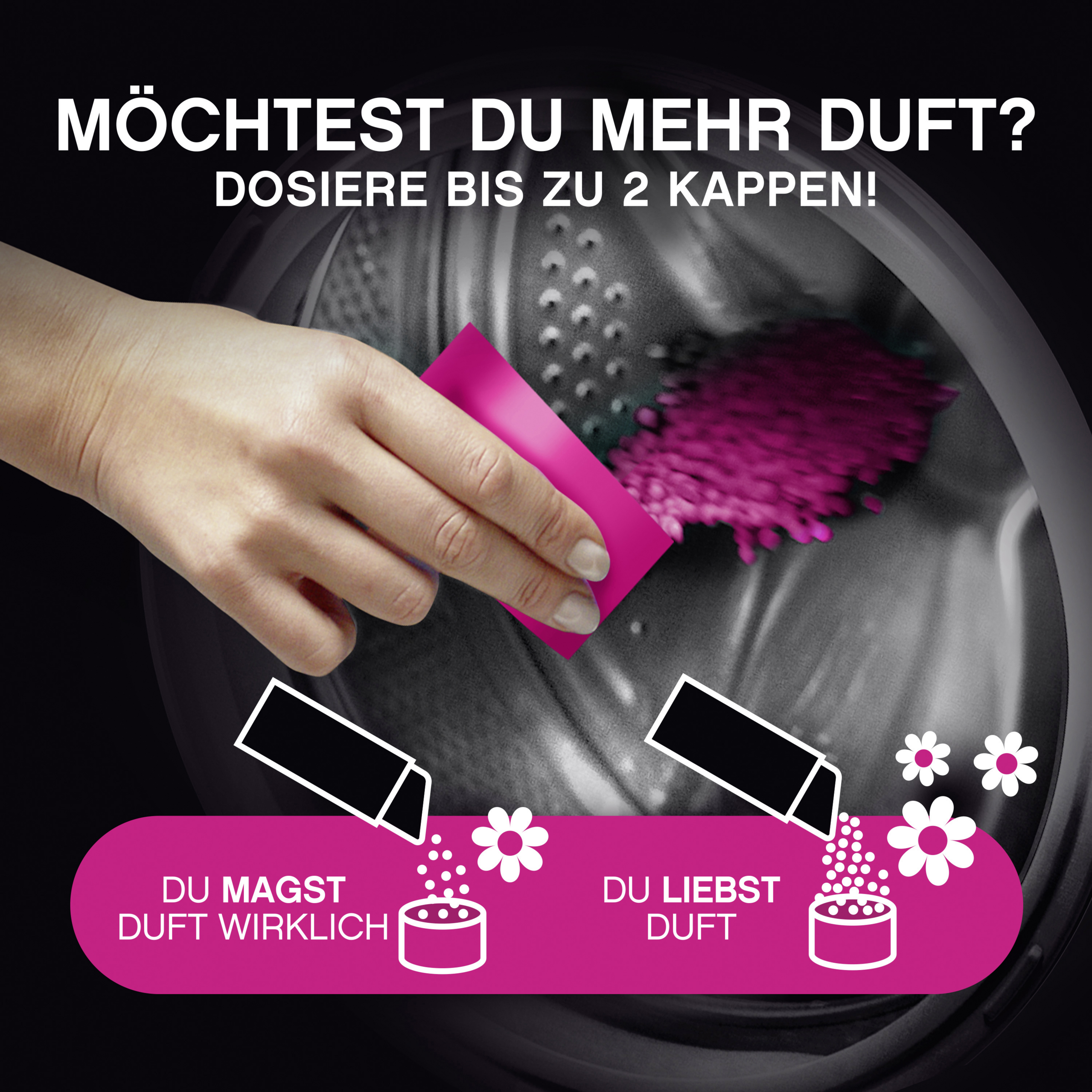 KAPPE ALS DOSIERHILFE VERWENDEN. Nach Gebrauch verschließen und außer Reichweite von Kindern aufbewahren. Empfohlene Dosierung = 12,2 g. Mit der Kappe dosieren und Duftperlen direkt in die Trommel geben. Kappe nicht mit in die Trommel geben. Nicht in das Weichspülerfach oder den Trockner geben. Vor direkter Sonneneinstrahlung und Temperaturen über 30°C schützen.