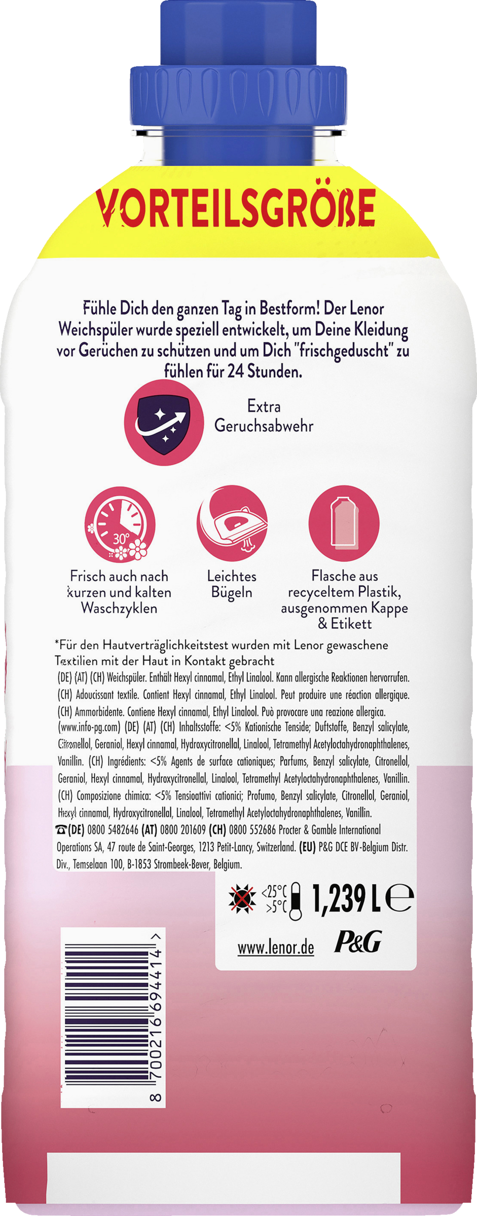 Der Lenor Weichspüler Frühlingsgarten verleiht für 24 Stunden ein „wie frisch geduscht" Gefühl - selbst nach Kaltwaschgängen. Die „Frischeschutz Technologie" von Lenor schützt Deine Kleidung beim Tragen vor unangenehmen Gerüchen. Verwende den Lenor Weichspüler für lang anhaltende Frische zusätzlich zu Deinem Waschmittel.