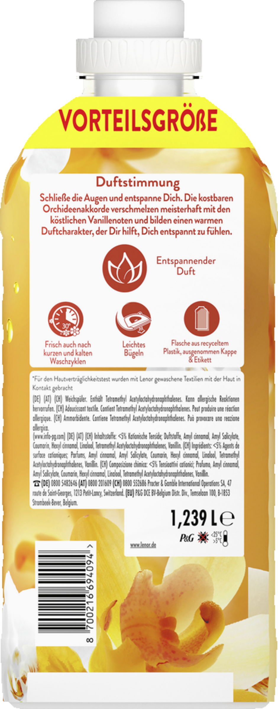 Der Lenor Weichspüler Goldene Orchidee sorgt für 24 Stunden Wohlfühlfrische und tagsüber für kleine Momente der Entspannung. Der Duft ist mit einer Note ätherischer Öle versehen. Schließe die Augen und entspanne dich. Die kostbaren Orchideenakkorde verschmelzen meisterhaft mit den köstlichen Vanillenoten und bilden einen warmen Duftcharakter, der Dir hilft, Dich zu Entspannen. Für unwiderstehliche Frische verwende den Lenor Weichspüler zusammen mit dem passenden Lenor Wäscheparfüm.