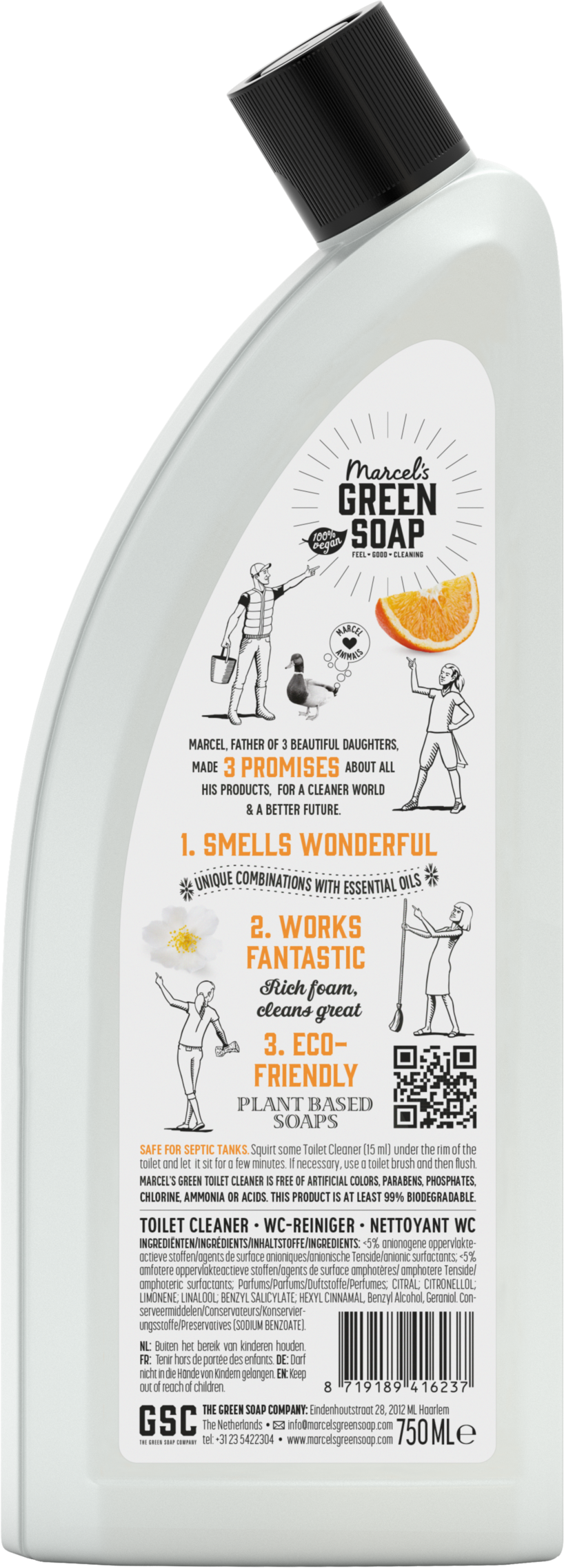 Wie alle Produkte von Marcel's Green Soap enthält unser WC-Reiniger keine Farbstoffe, Parabene, Phosphate, Chlor, Ammoniak oder Säuren. Basierend auf der Natur, mindestens 97% biologisch abbaubar & 100% Vegan!