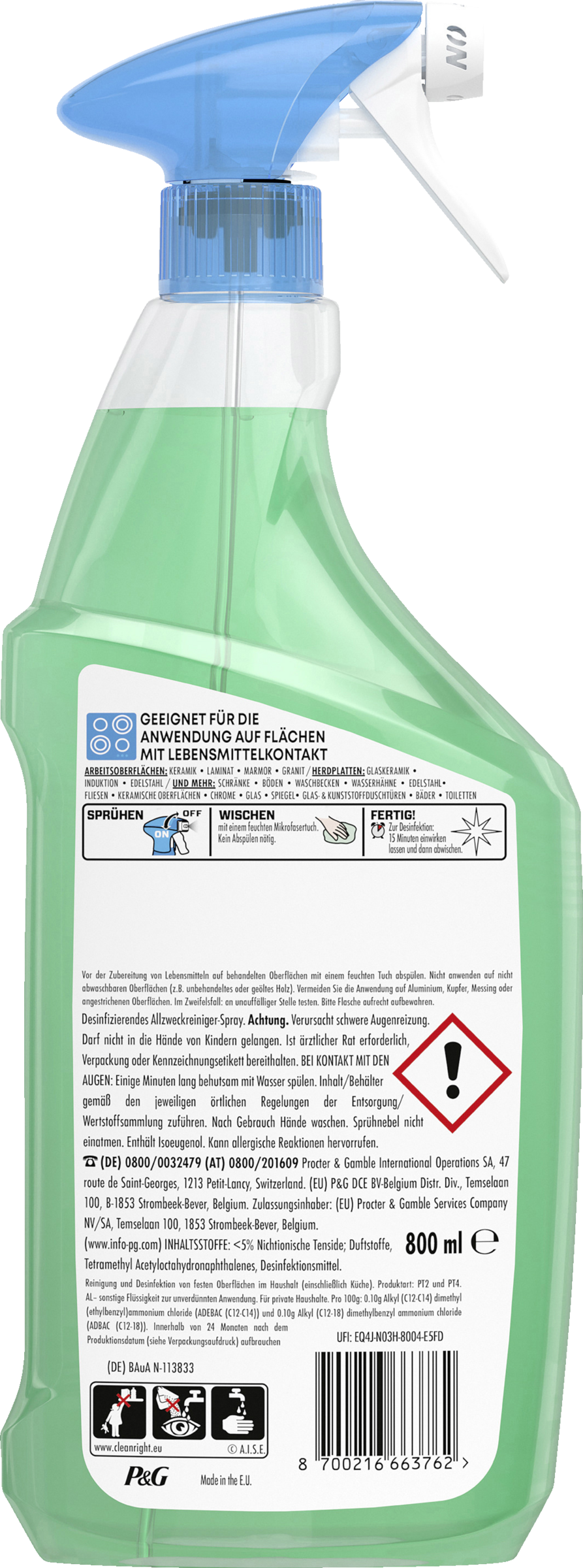 Verursacht schwere Augenreizung. Darf nicht in die Hände von Kindern gelangen. Ist ärztlicher Rat erforderlich, Verpackung oder Kennzeichnungsetikett bereithalten. BEI KONTAKT MIT DEN AUGEN: Einige Minuten lang behutsam mit Wasser spülen. Nach Gebrauch Hände waschen. Sprühnebel nicht einatmen. Reinigung und Desinfektion von festen Oberflächen im Haushalt (einschließlich Küche). Produktart: PT2 und PT4. AL- sonstige Flüssigkeit zur unverdünnten Anwendung. Für private Haushalte. Pro 100g: 0.10g Alkyl (C12-C14) dimethyl (ethylbenzyl)ammonium chloride (ADEBAC (C12-C14)) und 0.10g Alkyl (C12-18) dimethylbenzyl ammonium chloride (ADBAC (C12-18)). Enthält Isoeugenol. Kann allergische Reaktionen hervorrufen.