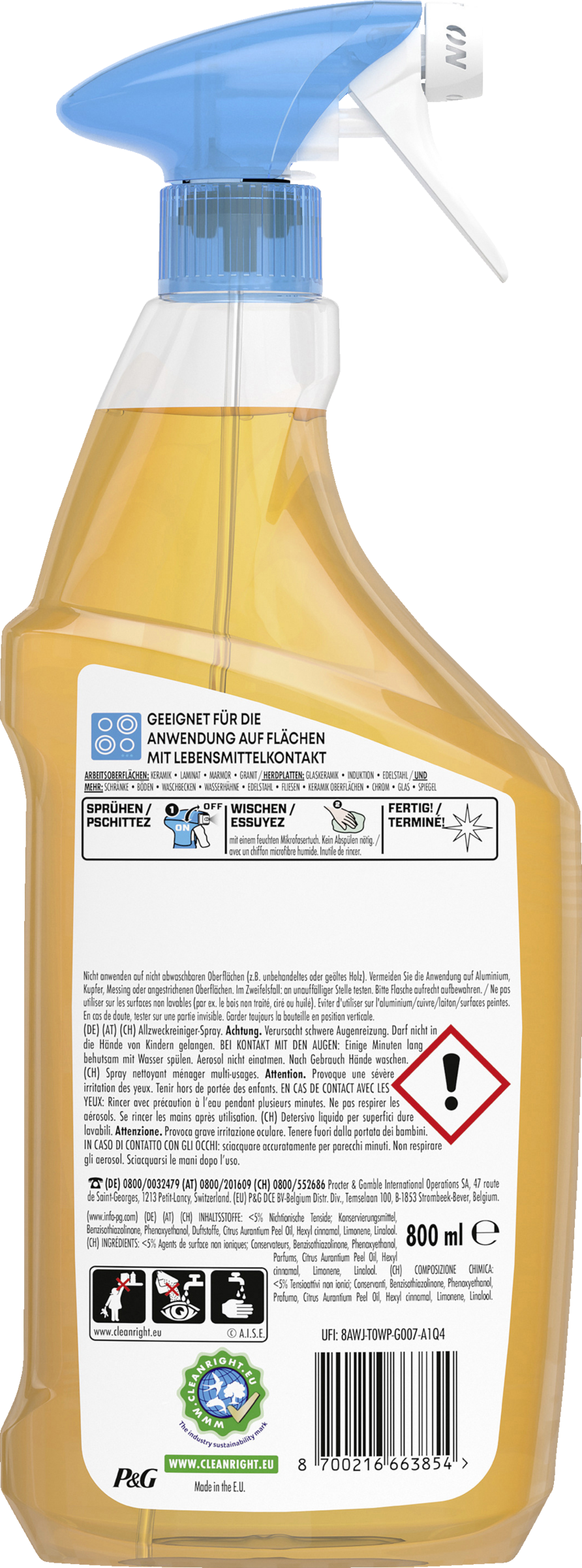 Das Meister Proper Sprühen-Wischen-Fertig Reinigungsspray wird die Art und Weise verändern, wie Sie Ihre Oberflächen reinigen! Einfach überall aufsprühen, darüberwischen und fertig! So einfach ist das! Es entfernt Fett auf Ihren Oberflächen sofort und ohne zusätzliche Schritte - kein Schrubben, keine Streifen. Es lässt nichts zurück außer strahlende Sauberkeit und hellen Glanz. Es kann sicher auf Oberflächen mit Lebensmittelkontakt verwendet werden und hinterlässt keine aggressiven Rückstände. Erhältlich mit einem herrlichen Orangen-Duft. Oberflächen, die direkt mit Lebensmitteln in Kontakt kommen, nach der Reinigung abspülen.