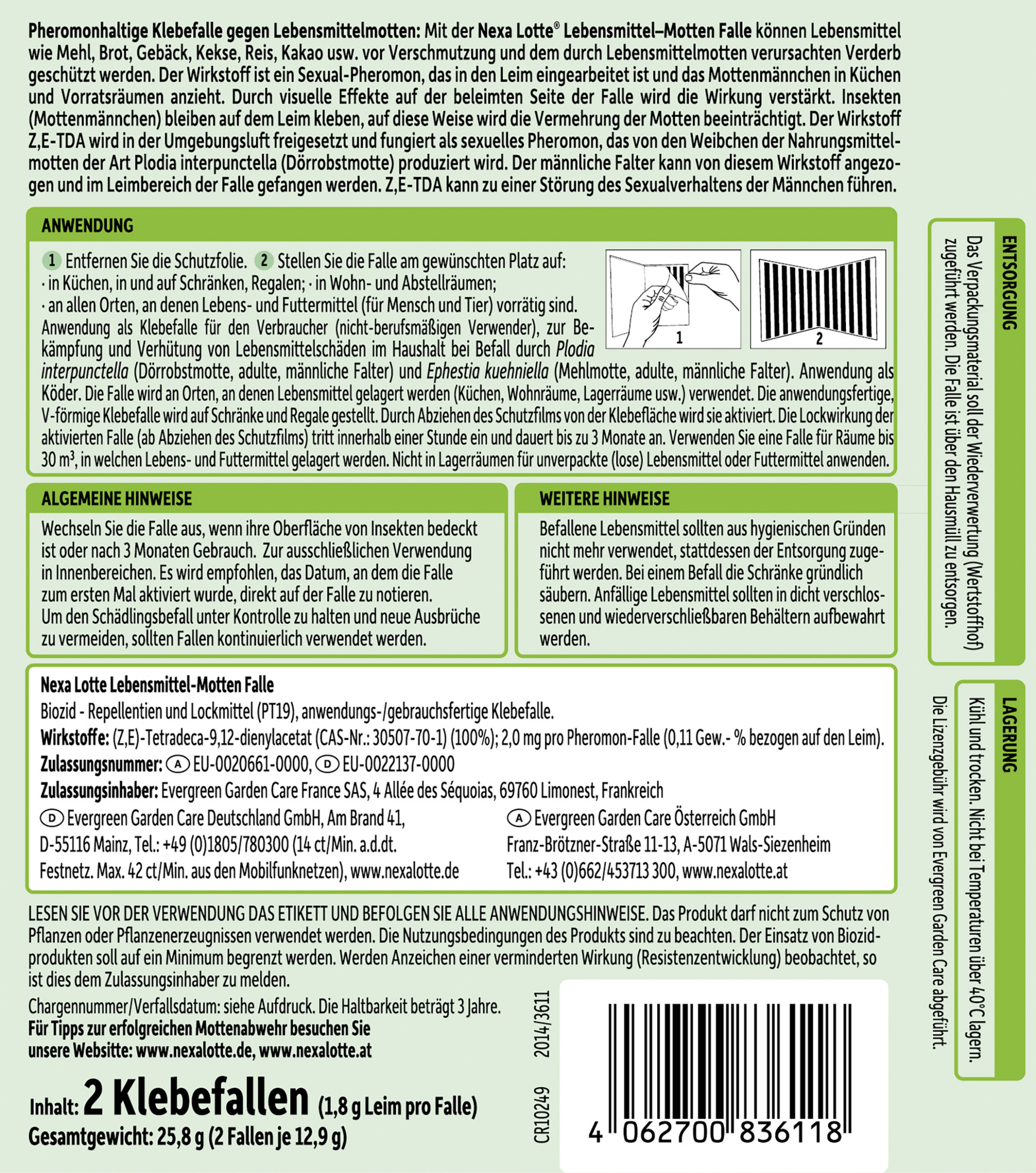 Pheromonhaltige Klebefalle gegen Lebensmittelmotten: Mit der Nexa Lotte® Lebensmittel-Motten Falle können Lebensmittel wie Mehl, Brot, Gebäck, Kekse, Reis, Kakao usw. vor Verschmutzung und dem durch Lebensmittelmotten verursachten Verderb geschützt werden. Der Wirkstoff ist ein Sexual-Pheromon, das in den Leim eingearbeitet ist und das Mottenmännchen in Küchen und Vorratsräumen anzieht. Durch visuelle Effekte auf der beleimten Seite der Falle wird die Wirkung verstärkt. Insekten (Mottenmännchen) bleiben auf dem Leim kleben, auf diese Weise wird die Vermehrung der Motten beeinträchtigt. Der Wirkstoff Z,E-TDA wird in der Umgebungsluft freigesetzt und fungiert als sexuelles Pheromon, das von den Weibchen der Nahrungsmittelmotten der Art Plodia interpunctella (Dörrobstmotte) produziert wird. Der männliche Falter kann von diesem Wirkstoff angezogen und im Leimbereich der Falle gefangen werden. Z,E-TDA kann zu einer Störung des Sexualverhaltens der Männchen führen.