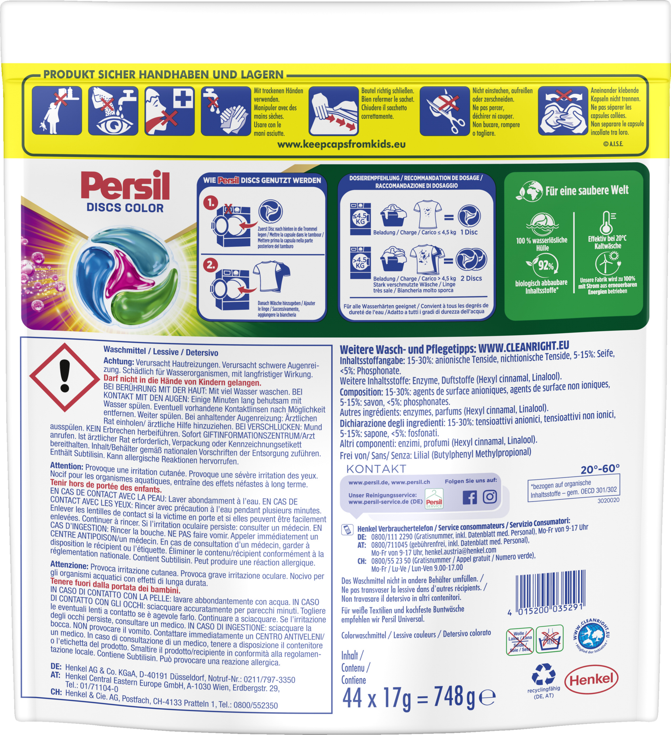 Die PERSIL Tiefenrein Color 4in1 DISCS vereinen strahlend reine Wäsche mit hygienischer Frische für die Maschine. Die einzigartige Formel mit Tiefenrein-Frische dringt tief in die Fasern ein, um selbst die hartnäckigsten Flecken zu lösen und zu beseitigen. Gleichzeitig ist das leistungsstarke Waschmittel mehr als nur ein Fleckenentferner für Kleidung: Unangenehme Gerüche, die aufgrund von Ablagerungen aus der Waschmaschine kommen können, werden wirksam bekämpft. Das Produkt enthält 92 % biologisch abbaubare Inhaltsstoffe** und 100 % recycelbare Papierfasern in der Verpackung* – für eine saubere Welt.