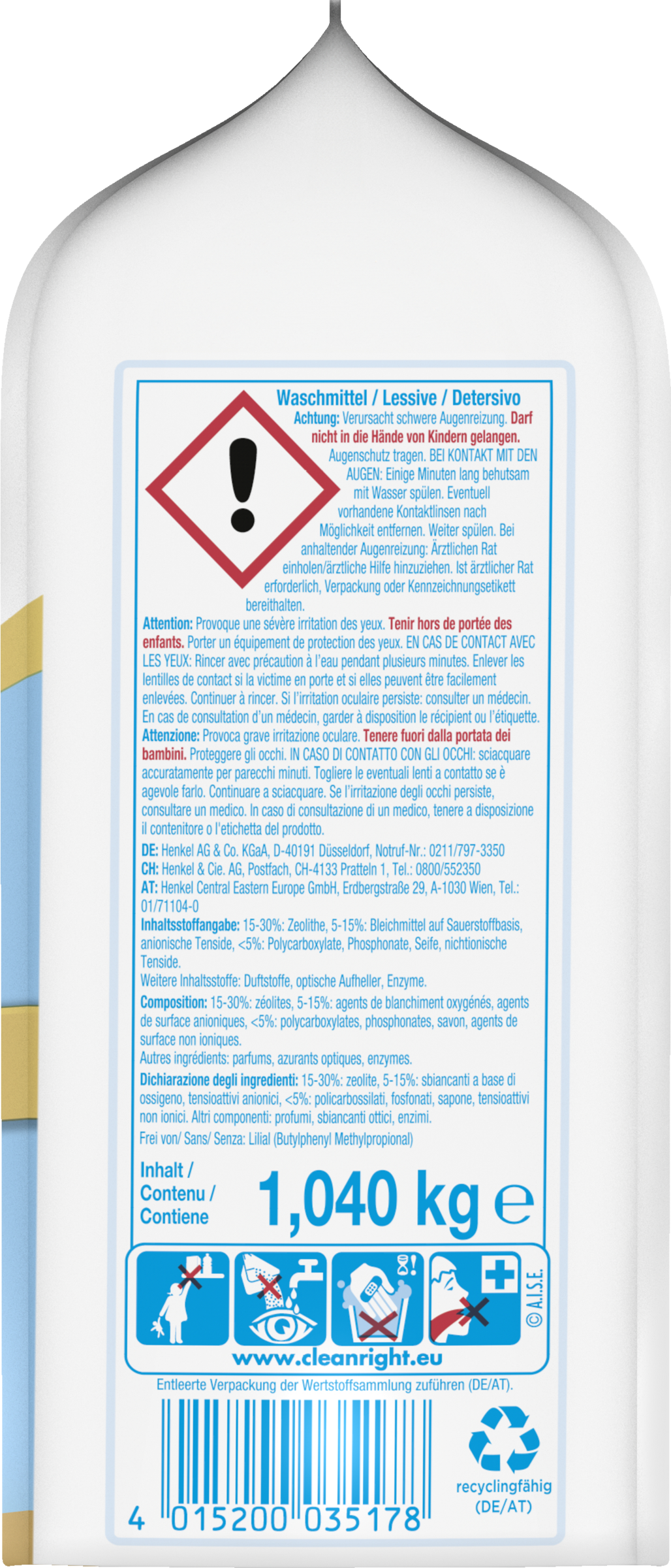 15-30%: Zeolithe, 5-15%: Bleichmittel auf Sauerstoffbasis, anionische Tenside, <5%: Polycarboxylate, Phosphonate, Seife, nichtionische Tenside. Weitere Inhaltsstoffe: Duftstoffe, optische Aufheller, Enzyme.