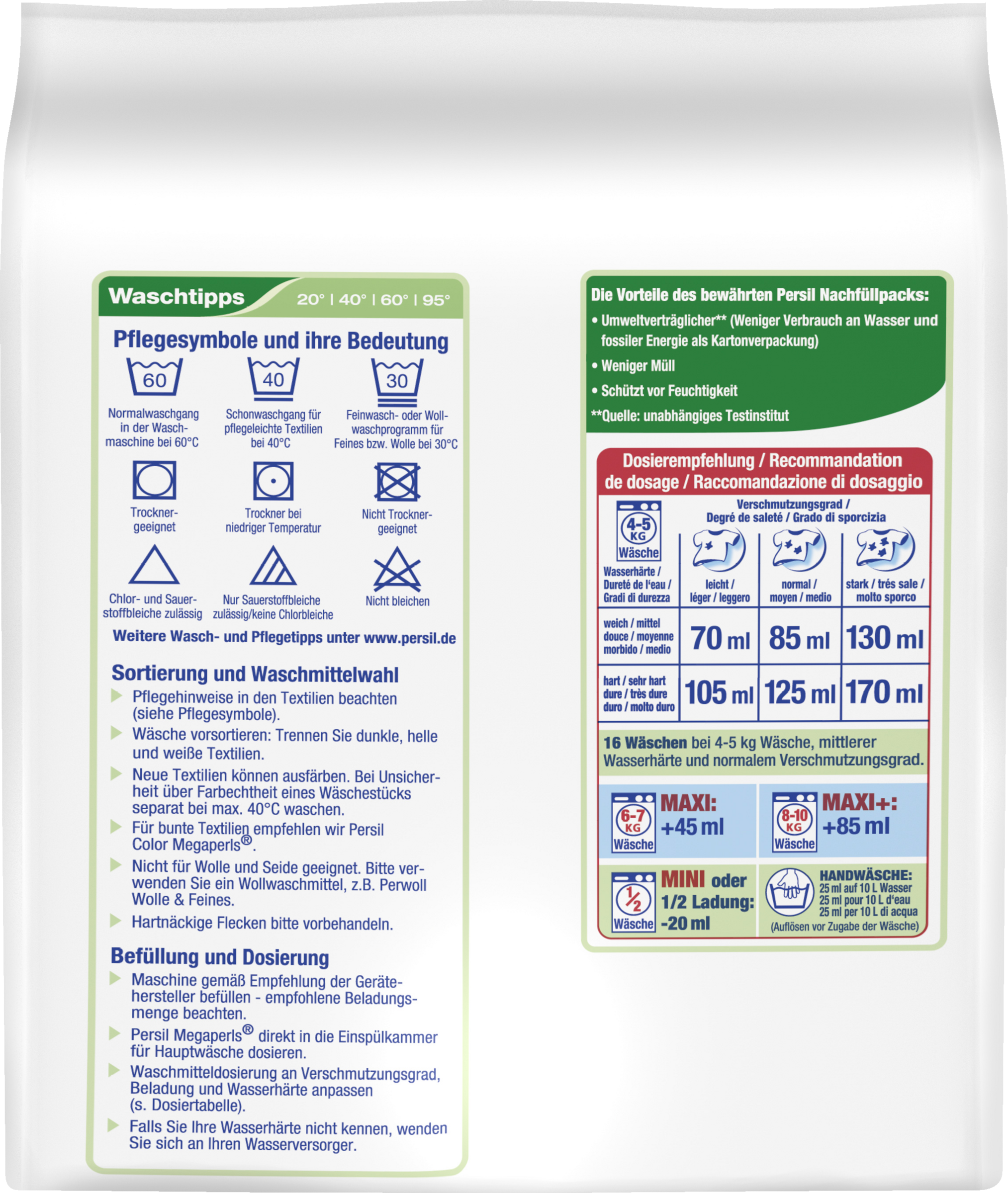 Es sollte immer die Dosieranweisung auf der Verpackung geprüft werden. Die Dosieranweisung ist abhängig von der Größe der Waschmaschine, der Wasserhärte und dem Verschmutzungsgrad der Wäsche.