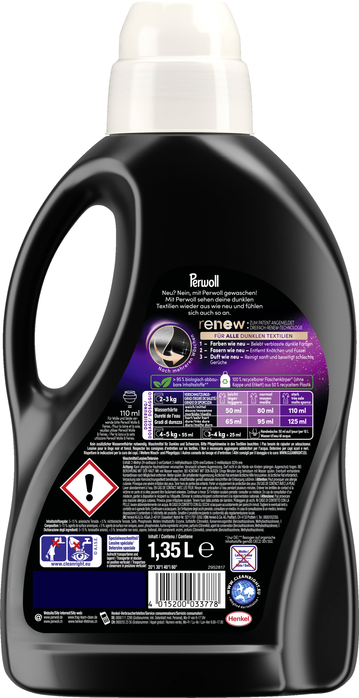 Perwoll Black pflegt und schützt deine schwarze und dunkle Kleidung bereits ab der ersten Wäsche. Die fortschrittliche Pflegeformel belebt und schützt die Farbintensität, glättet aufgeraute Fasern für optimale Lichtreflexion und repariert Mikroschäden für mehr Elastizität und noch stärkere Fasern. Die Formelbesteht zu >95% aus biologisch abbaubaren Inhaltsstoffen*. Der Flaschenkörper (ohne Kappe und Etikett) ist zu 100% recycelbar und besteht zu 50% aus recyceltem Plastik.