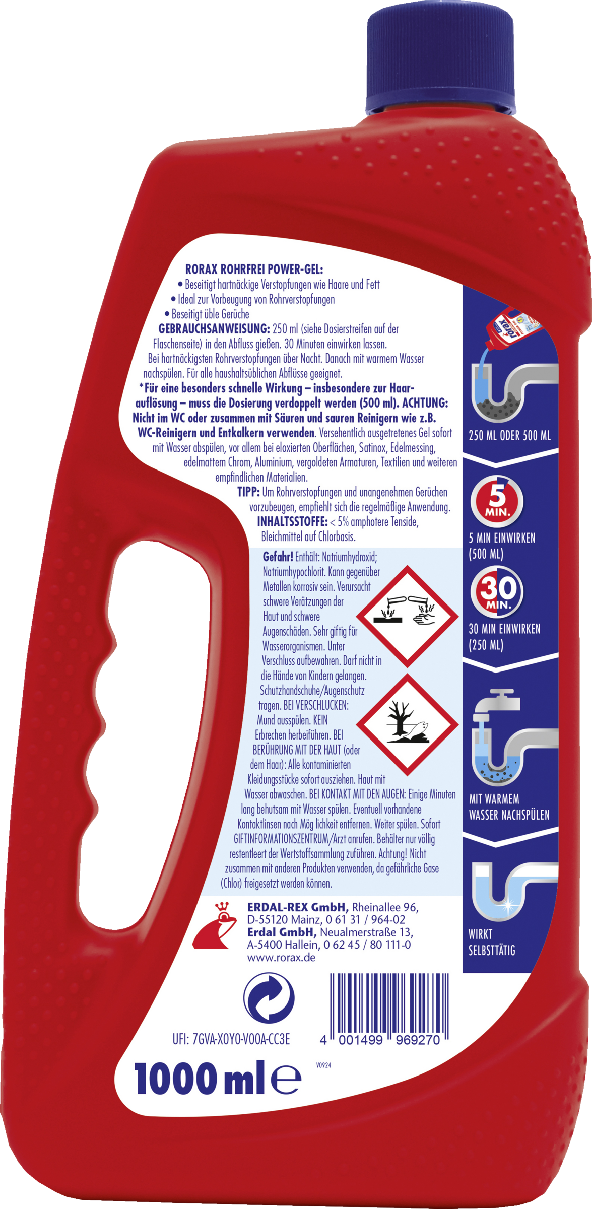 Das rorax Rohrfrei Power-Gel ist ein leistungsfähiger Rohrreiniger, der wirkungsvoll hartnäckige Abflussverstopfungen beseitigt und dabei üble Gerüche bekämpft. Die besonders kraftvolle Rezeptur löst problemlos Haare und fetthaltige Verstopfungen auf – und das sogar in 5 Minuten! Das rorax Rohrfrei Power-Gel ist für alle Abflüsse und Abflussrohre in der Küche und im Bad geeignet.