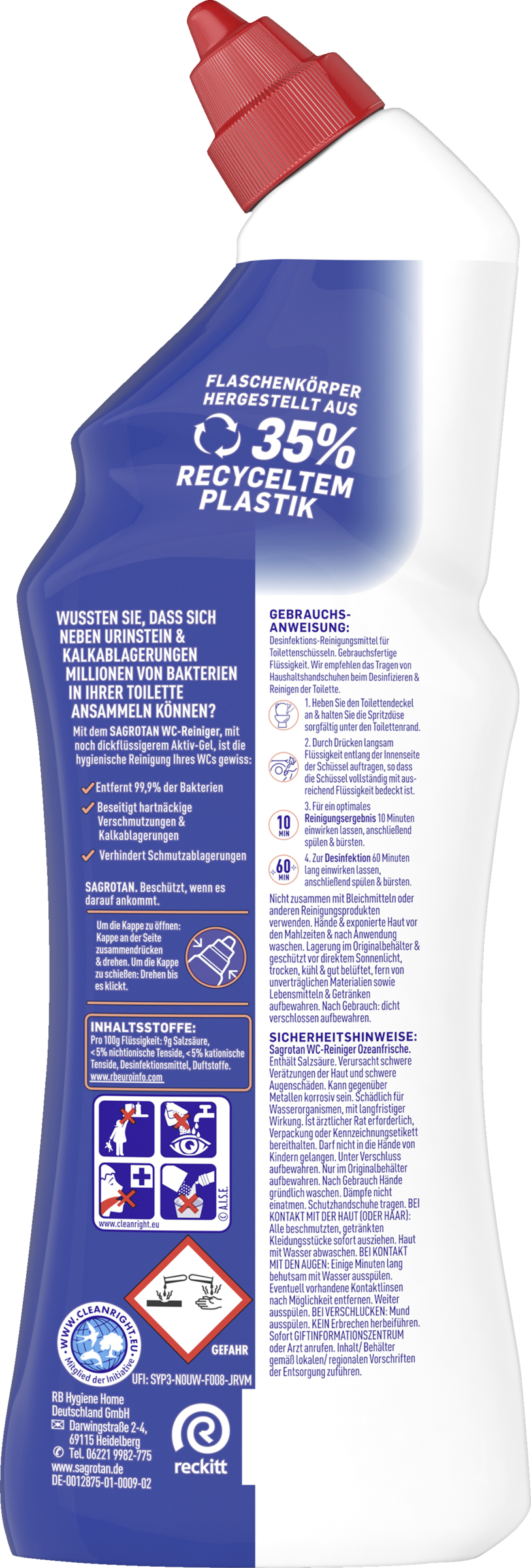 SAGROTAN WC-Reiniger Ozeanfrische. Enthält Salzsäure. Verursacht schwere Verätzungen der Haut und schwere Augenschäden. Kann gegenüber Metallen korrosiv sein. Schädlich für Wasserorganismen, mit langfristiger Wirkung. Darf nicht in die Hände von Kindern gelangen. BEI VERSCHLUCKEN: Mund ausspülen. KEIN Erbrechen herbeiführen. Sofort GIFTINFORMATIONSZENTRUM oder Arzt anrufen. BEI EINATMEN: Die Person an die frische Luft bringen und für ungehinderte Atmung sorgen. BEI KONTAKT MIT DEN AUGEN: Einige Minuten lang behutsam mit Wasser ausspülen. Eventuell vorhandene Kontaktlinsen nach Möglichkeit entfernen. Weiter ausspülen. Freisetzung in die Umwelt vermeiden. Inhalt/ Behälter gemäß lokalen / regionalen Vorschriften der Entsorgung zuführen.
