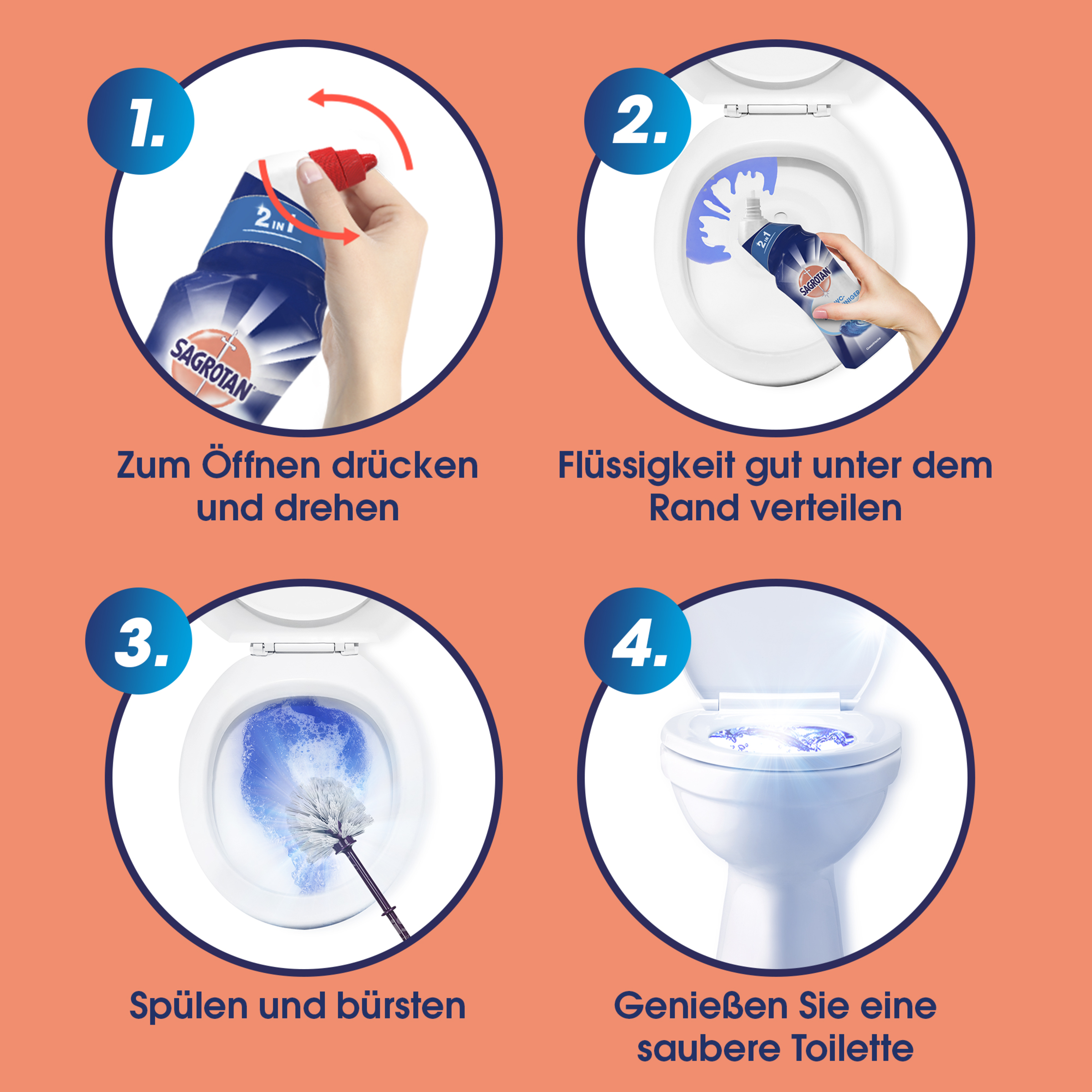 Mit dem SAGROTAN WC-Reiniger ist die hygienische Reinigung Ihres WCs gewiss. Der Reiniger bildet einen Anti-Schmutz-Film, der neue Schmutzablagerungen verhindert.Zusätzlich werden 99,9% der Bakterien zuverlässig entfernt. Zurück bleibt ein leichter Duft nach Ozeanfrische. SAGROTAN. Beschützt, wenn es darauf ankommt.