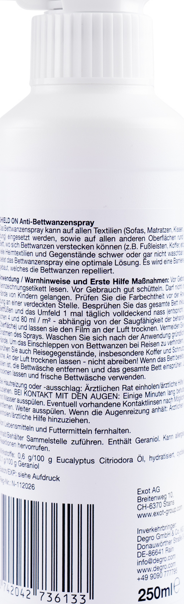 Vor Gebrauch Kennzeichnungsetikett lesen. Vor Gebrauch gut schütteln. Darf nicht in die Hände von Kindern gelangen. Prüfen Sie die Farbechtheit vor der Anwendung an einer verdeckten Stelle. Besprühen Sie das gesamte Bett einschließlich des Rahmens und das Umfeld 1 mal täglich volldeckend nass (entspricht ca. 40 und 80 ml/m² - abhängig von der Saugfähigkeit der zu behandelnden Oberfläche) und lassen Sie den Film an der Luft trocknen. Vermeiden Sie direkten Kontakt mit dem Spray. Waschen Sie sich nach der Anwendung gründlich die Hände. Um das Einschleppen von Bettwanzen bei Reisen zu verhindern, desinfizieren Sie auch Reisegegenstände, insbesondere Koffer und Schuhe. An der Luft trocknen lassen - nicht abreiben! Wenn das Bett bereits befallen ist, die Bettwäsche entfernen und das gesamte Bett einsprühen, trocknen lassen und frische Bettwäsche verwenden.