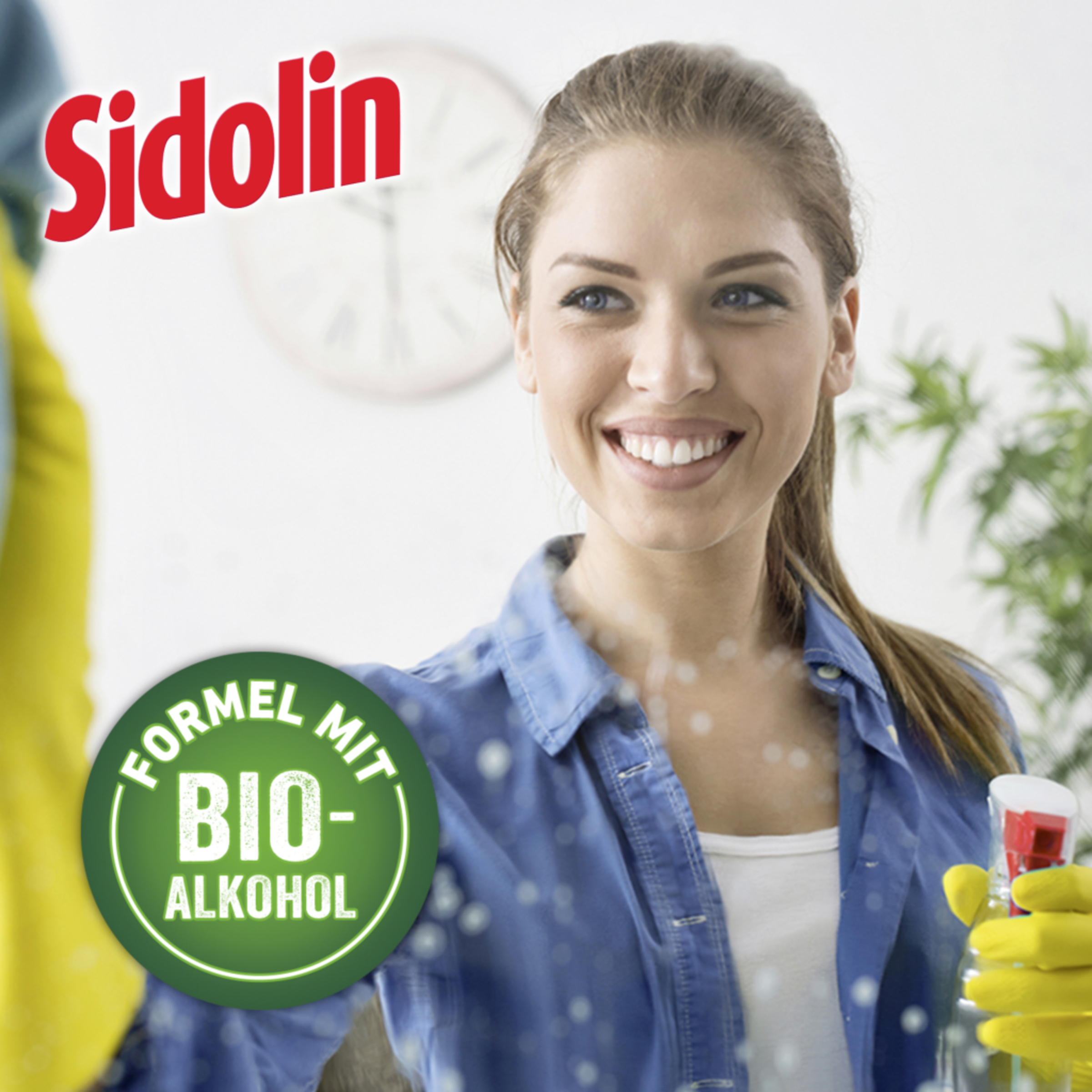 Sidolin mit Bio-Alkohol (Alkohol aus fermentierten, natürlichen Rohstoffen wie Getreide oder Zuckerrüben) bietet eine perfekte Reinigungsleistung und langanhaltenden, streifenfreien Glanz für Fenster und Glasoberflächen. Die innovative All in 1 Formel mit der Kraft von Bio-Alkohol:
