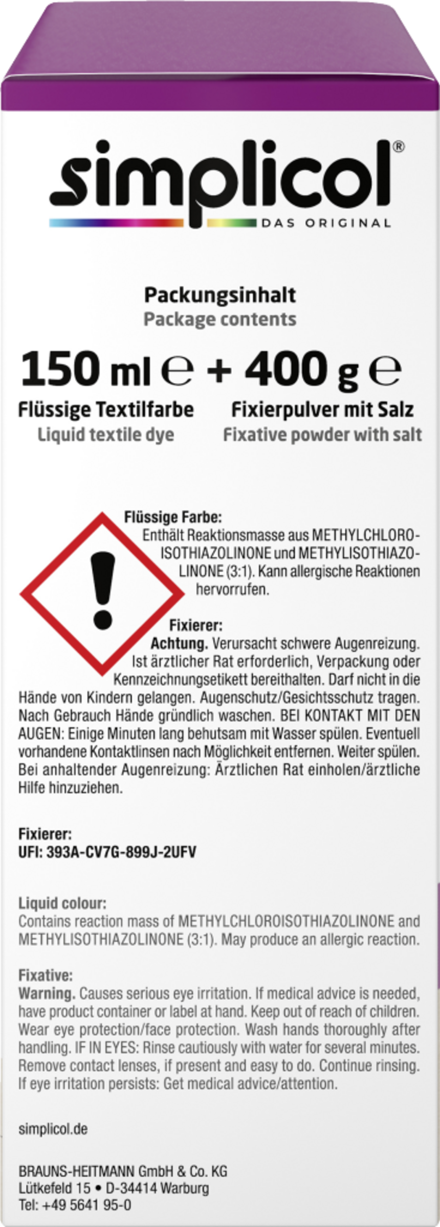 Hinweise: Bitte max. 2 Packungen simplicol Textilfarbe intensiv pro Färbevorgang verwenden. Maximal 1200g Wäsche auf einmal färben. Muster bleiben nach dem Färben häufig sichtbar. Polyester-Nähte, Reißverschlüsse nehmen die Farbe nicht an. Manchmal werden Flecken, verblichene Stellen oder Bleichmittelspuren beim Färben nicht vollständig verdeckt. Nicht färben können Sie reine Synthetics wie Polyester, Polyamid Acryl sowie Wolle, Seide und Textilien mit Spezialausrüstung. Im unwahrscheinlichen Fall von Farbresten an Maschine und Kunststoffteilen, können Sie diese mit 5-10%iger handelsüblicher Chlorbleiche abwischen.
