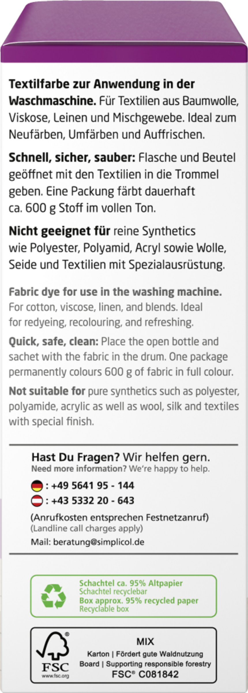 Gut zu wissen: Einmal nachwaschen reicht aus. Damit entfernen Sie eventuelle Farbreste aus Textil und Maschine. Sicher für Waschmaschine und Textil. Die Färbung ist unbedenklich für Waschmaschine und Textilien. Die Farbe, die hält: Kein Abfärben, kein Ausbluten. simplicol Textilfarbe intensiv verbindet sich dauerhaft mit dem Textil. Gefärbte Textilien können laut Wäscheetikett gewaschen werden (kalt bis 95°).