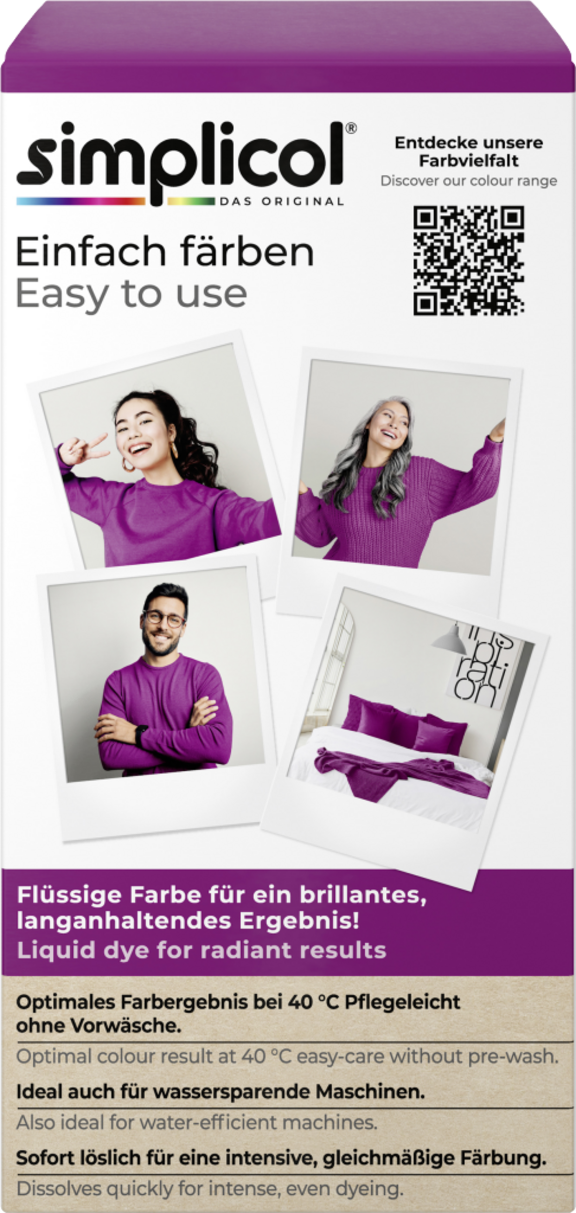 Farbe lieben, bunter leben: Mit der simplicol Textilfarbe intensiv geht das ganz einfach. Verleihe deiner Kleidung und Heimtextilien in nur einem Waschgang einen neuen Look.