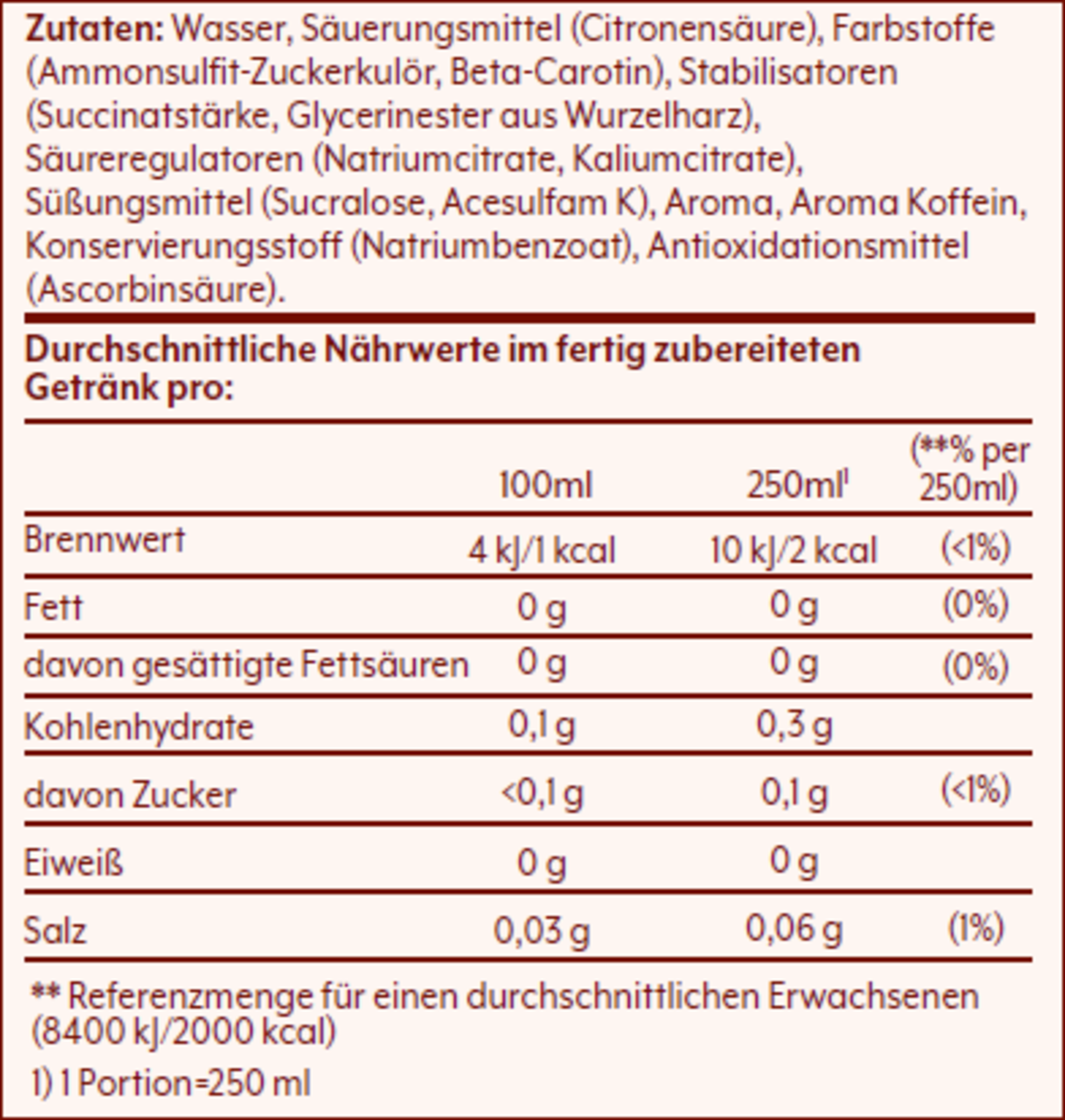 Wasser, Farbstoff (Ammonsulfit-Zuckerkulör, Beta-Carotin), Säuerungsmittel ( Citronensäure), Stabilisatoren (Succinatstärke, Glycerinester aus Wurzelharz), Säureregulatoren (Natriumcitrate, Kaliumcitrate), Süßungsmittel (Sucralose, Acesulfam K), Aroma, Aroma Koffein, Konservierungsstoff (natriumbenzoat), Antioxidationsmittel (Ascorbinsäure).