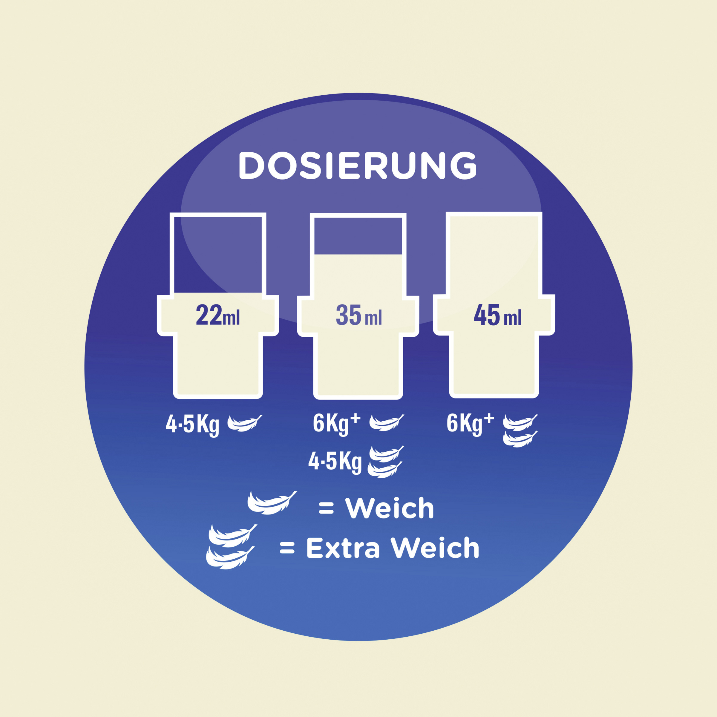Handwäsche: 10 ml in 5 L Wasser dosieren. 45 Waschladungen basierend auf einer Füllmenge von 4-5 kg. Soflan in die Weichspülkammer Ihrer Waschmaschine geben.