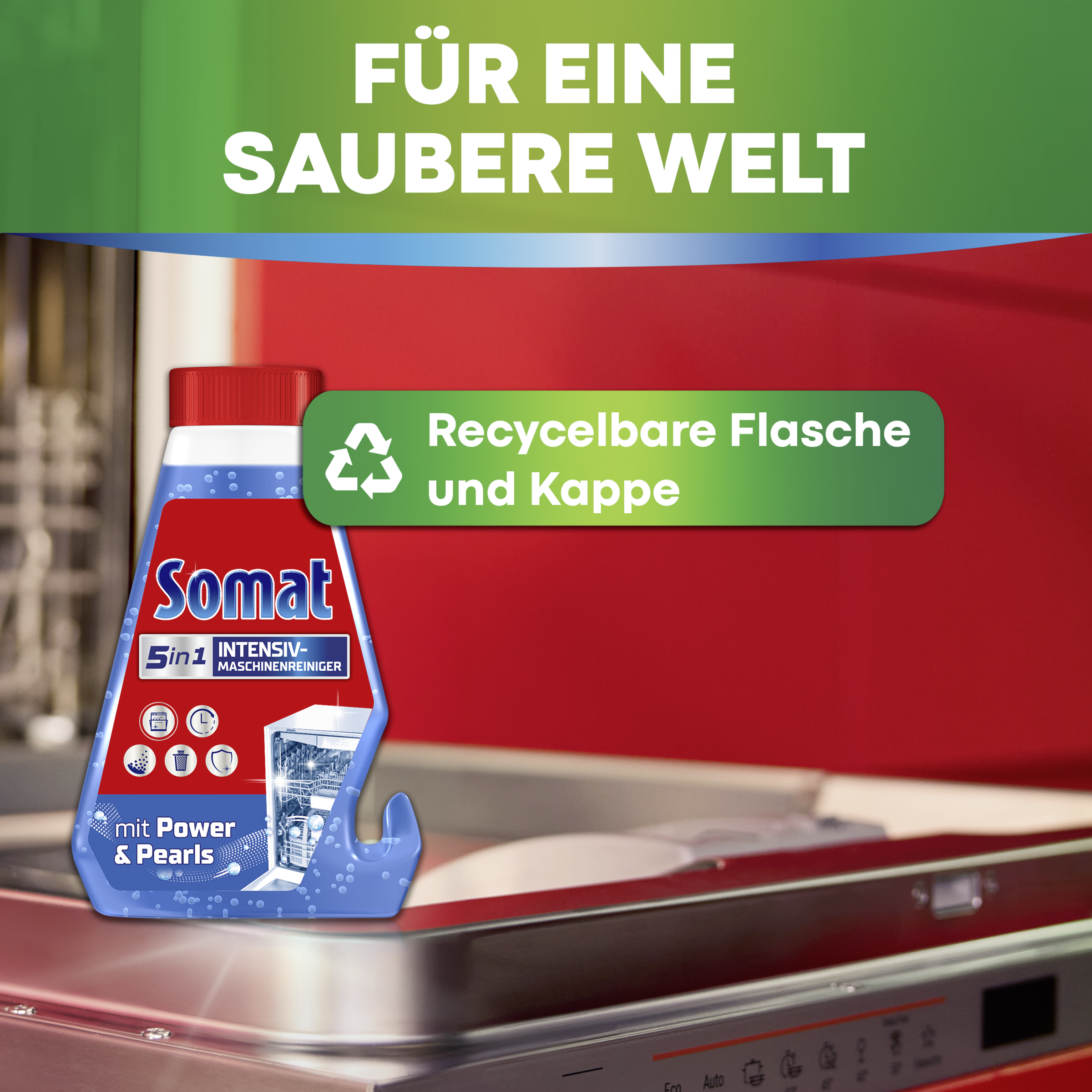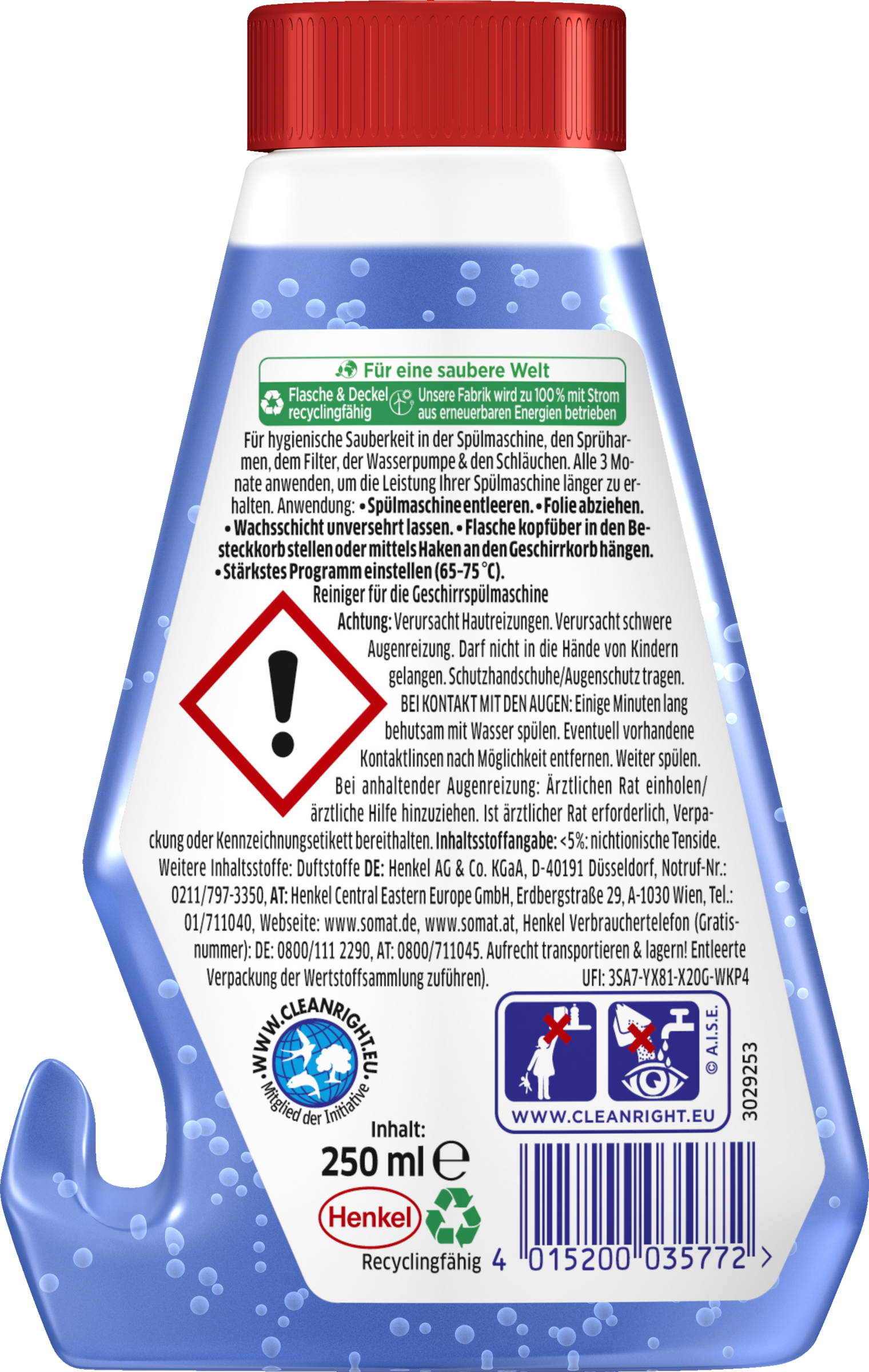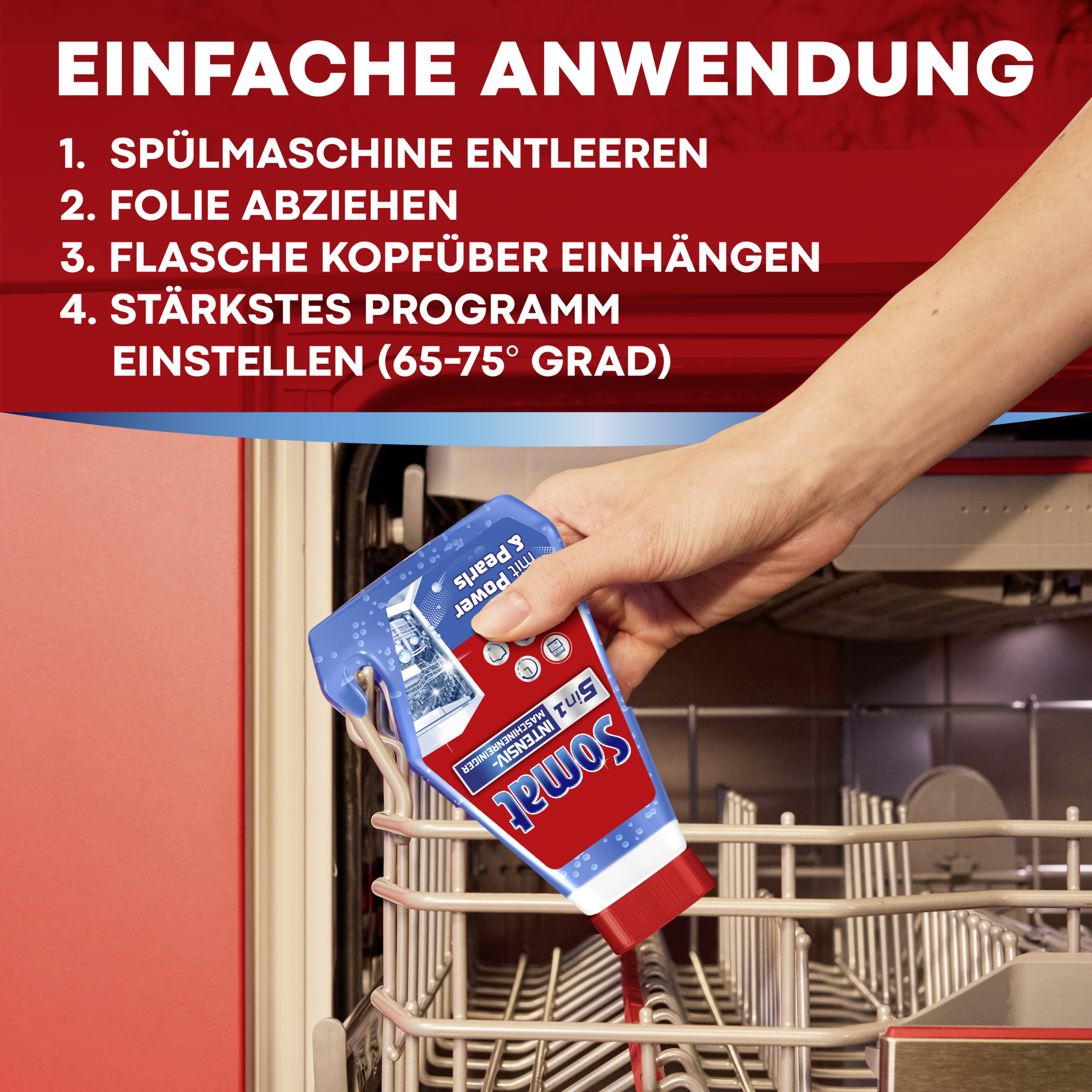 Somat 5in1 Intensiv-Maschinenreiniger – Für eine hygienisch saubere und langlebige Spülmaschine Der Somat Intensivreiniger mit Power Pearls wurde für die regelmäßige Spülmaschinenreinigung & -pflege entwickelt und befreit die Maschine von Fett, Kalk, Gerüchen und Schmutzablagerungen. Für eine hygienisch saubere und langlebige Spülmaschine! Einfach die Folie von der Wachsschicht auf der Flasche entfernen und den Spülmaschinenreiniger mit der Oberseite nach unten einsetzen. Dank des praktischen Hakens passt die Flasche in jede Spülmaschine. Der Somat Geschirrspülreiniger und -entkalker sollte einmal alle drei Monate im Leerlauf und bei einem Programm von 65° - 75 °C verwendet werden, um optimale Ergebnisse zu erzielen.Somat setzt sich zudem für eine saubere Welt ein: Der Reiniger & Kalkentferner wird mit recyclingfähiger Flasche und Deckel geliefert, zudem wird die Fabrik zu 100% mit Strom aus erneuerbaren Energien betrieben.
