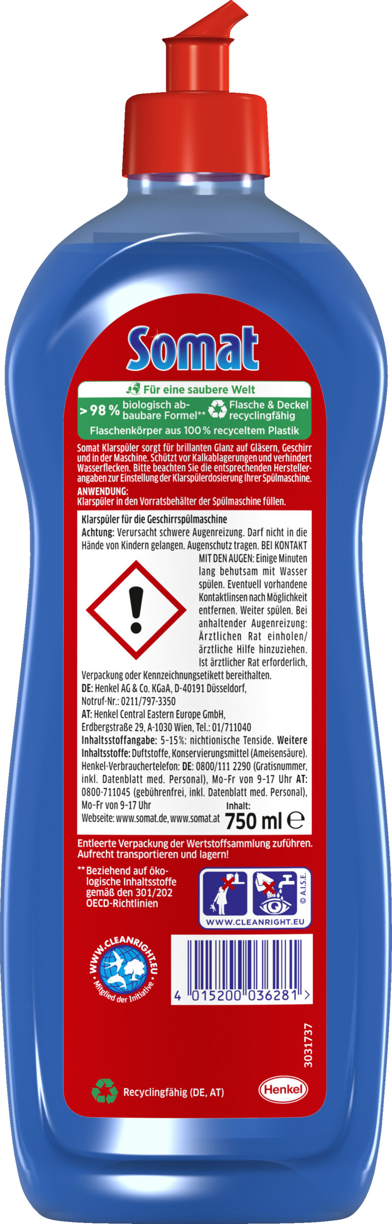 Somat 5in1 Klarspüler – 5in1-Formel für glänzende, schnell trocknende Ergebnisse Brillant glänzende Ergebnisse für Geschirr, Gläser und Maschine: Der Somat Klarspüler sorgt dank 5in1-Formel für optimale Spül-Ergebnisse. Dank des glasschützenden Wirkstoffs werden Gläser und Dekor schonend rein, während Kalkablagerungen und Wasserflecken verhindert werden. Darüber hinaus sorgt die Formel für eine Extra Trocknung von Plastik.Somat setzt sich zudem für eine saubere Welt ein: Der Klarspüler für Spülmaschinen hat eine zu über 98% biologisch abbaubare Formel*, kommt in einem Flaschenkörper aus 100% recyceltem Plastik und Flasche & Deckel sind recyclingfähig. Darüber hinaus wird das Werk mit 100% erneuerbarem Strom betrieben, und die Produktion verursacht keinerlei Abfall auf der Mülldeponie.