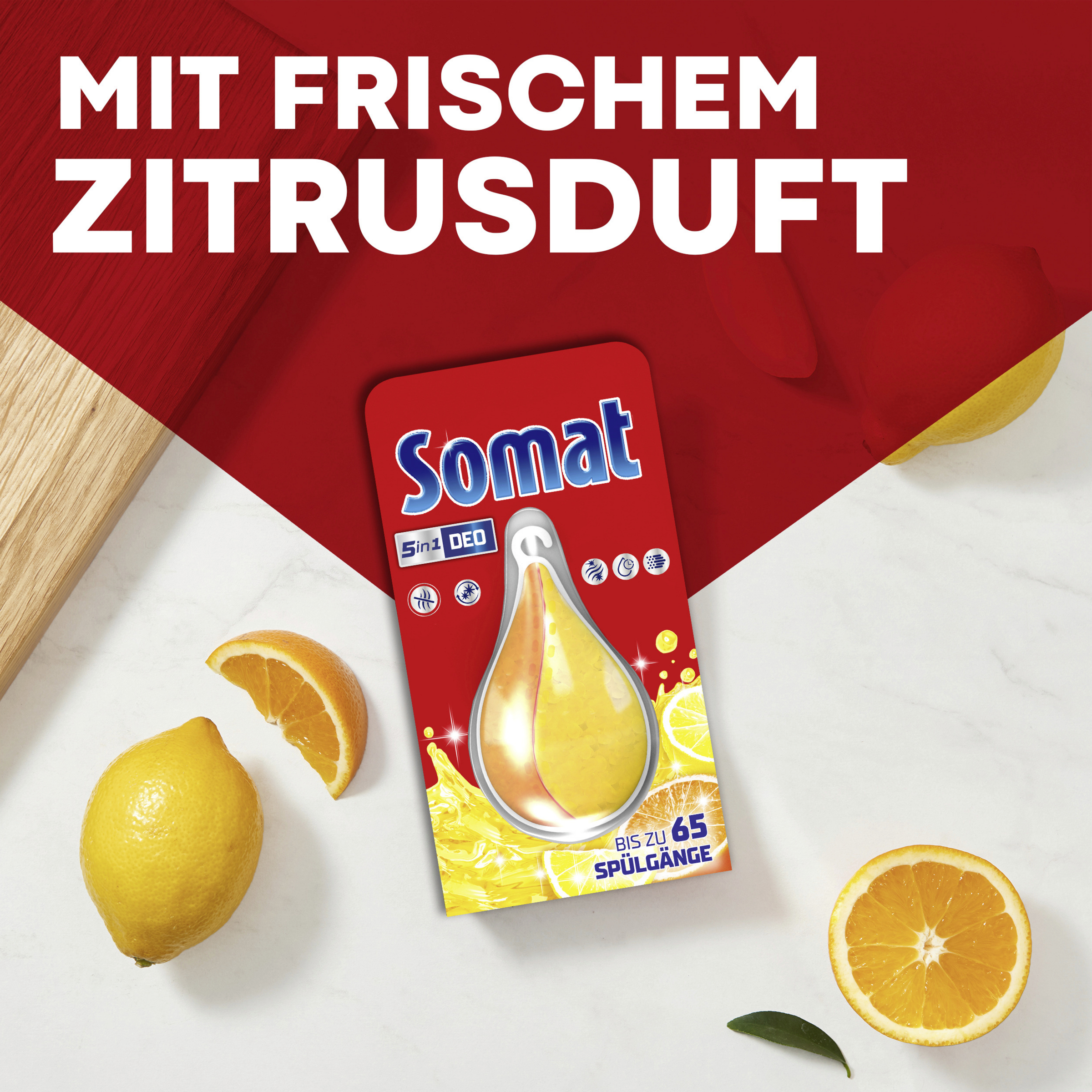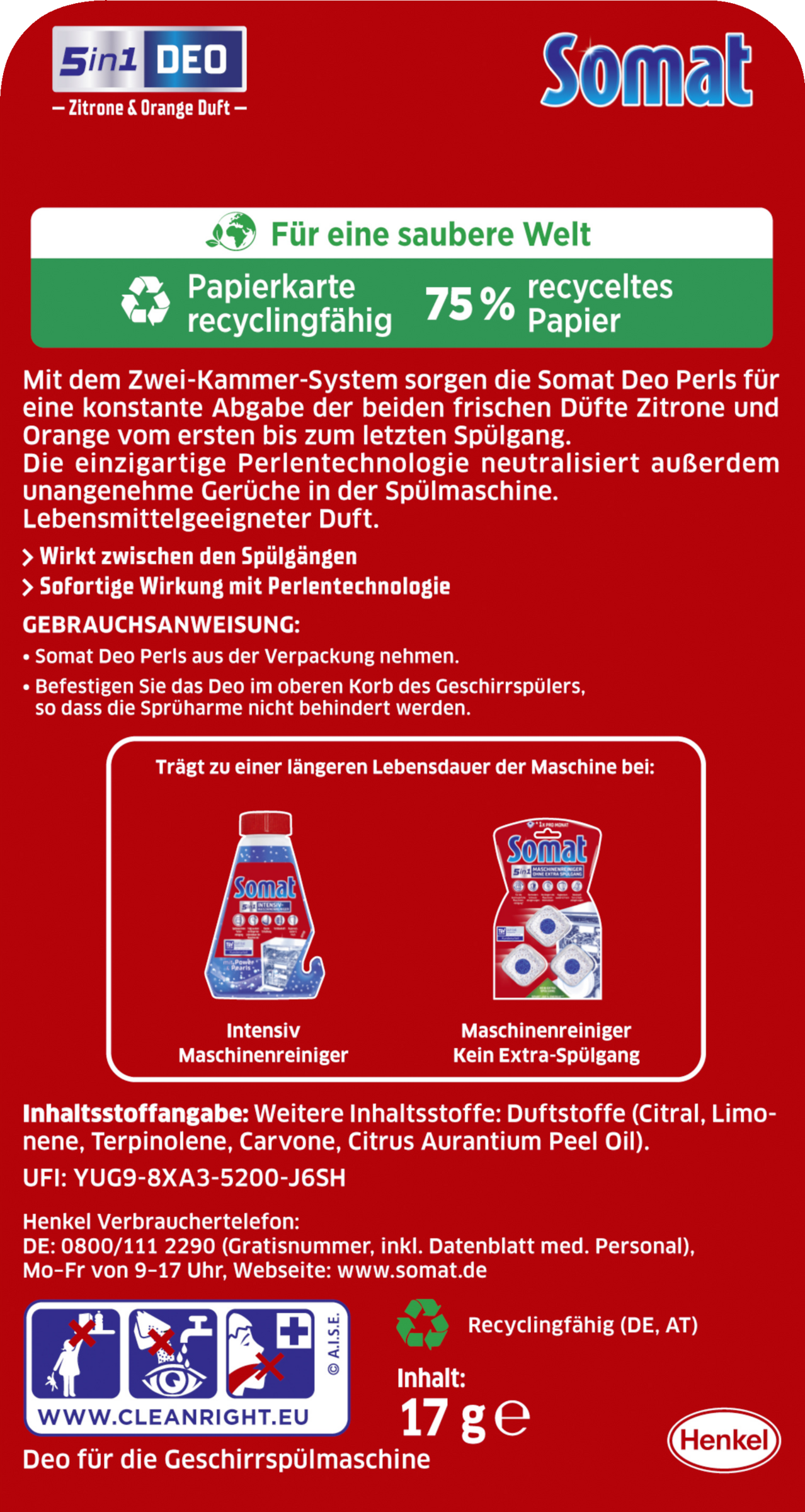 Die Somat Deo Perls® sorgen mit ihrem Zwei-Kammer-System für eine konstante Abgabe der beiden frischen Düfte Zitrone und Orange vom ersten bis zum letzten Spülgang. Zudem neutralisiert die einzigartige Perls Technologie unangenehme Gerüche in Ihrer Spülmaschine. So duftet der Innenraum Ihrer Spülmaschine immer angenehm frisch und sauber. Für bis zu 60 Spülgänge.