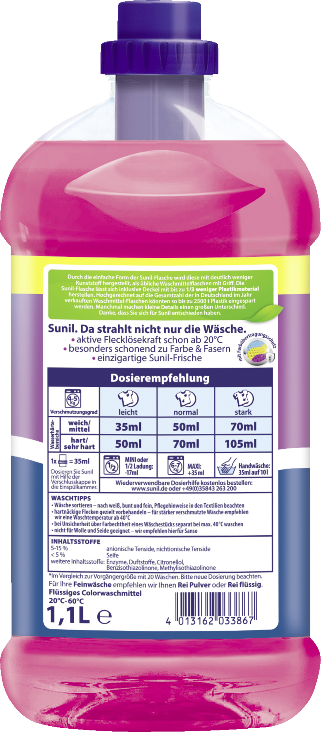 Sunil direkt in die Dosierkammer geben. Handwäsche: etwa 35 ml Sunil flüssig in 10 l Wasser auflösen. Ohne Einweichen zügig durchwaschen und gründlich ausspülen.