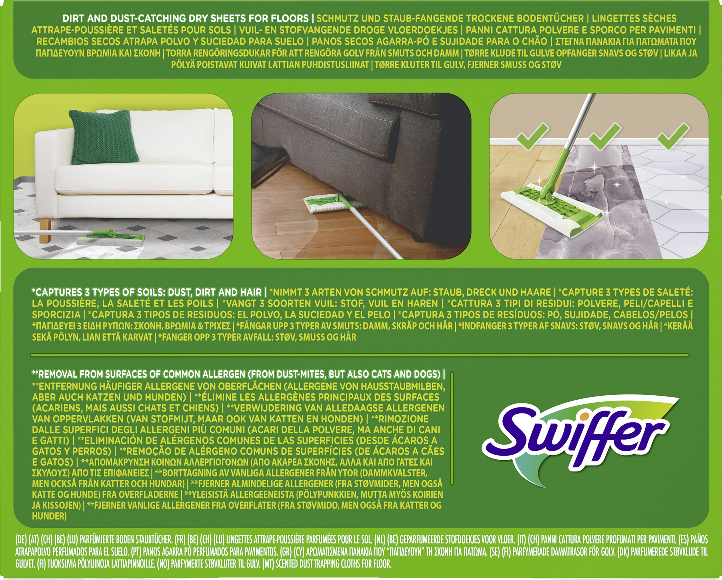 Swiffer Dry Nachfülltücher Clean & Fresh können mit dem Bodenwischer verwendet werden, um Staub, Schmutz und Haare von jeder Art Bodenfläche in Ihrem Zuhause einzufangen und einzuschließen. Dabei sind sie 3-mal effektiver als ein herkömmlicher Besen und hinterlassen außerdem einen schönen frischen Duft auf Ihren Böden. Mit dem Swiffer Dry können Sie Ihr Zuhause im Handumdrehen, mühelos und geräuschlos wieder sauber bekommen. Die perfekte Lösung, um feinen Staub in kleinen Ecken oder an schwer zugänglichen Stellen wie unter dem Sofa und dem Bett einzufangen, wo Besen und Staubsauger nicht immer hinkommen. Die Dichte, spezifische Oberflächenstruktur und elektrostatische Wirkung der Staubtücher ermöglichen es, den gesamten Staub einzufangen und im Inneren des Tuchs einzuschließen. Dabei hinterlassen sie einen langanhaltenden, frischen Duft im Raum. Bodenreinigung war noch nie so schnell und einfach wie mit Swiffer Dry. Guter Tipp: Dieser eignet sich hervorragend zum Entfernen von Tierhaaren, die unsere Haustiere ständig verlieren, sowie für Hausstauballergiker. Swiffer Bodentücher können auf allen harten Oberflächen eingesetzt werden: auf gewachstem oder ungewachstem Linoleum, Vinyl, Keramik und behandelten Holzböden.