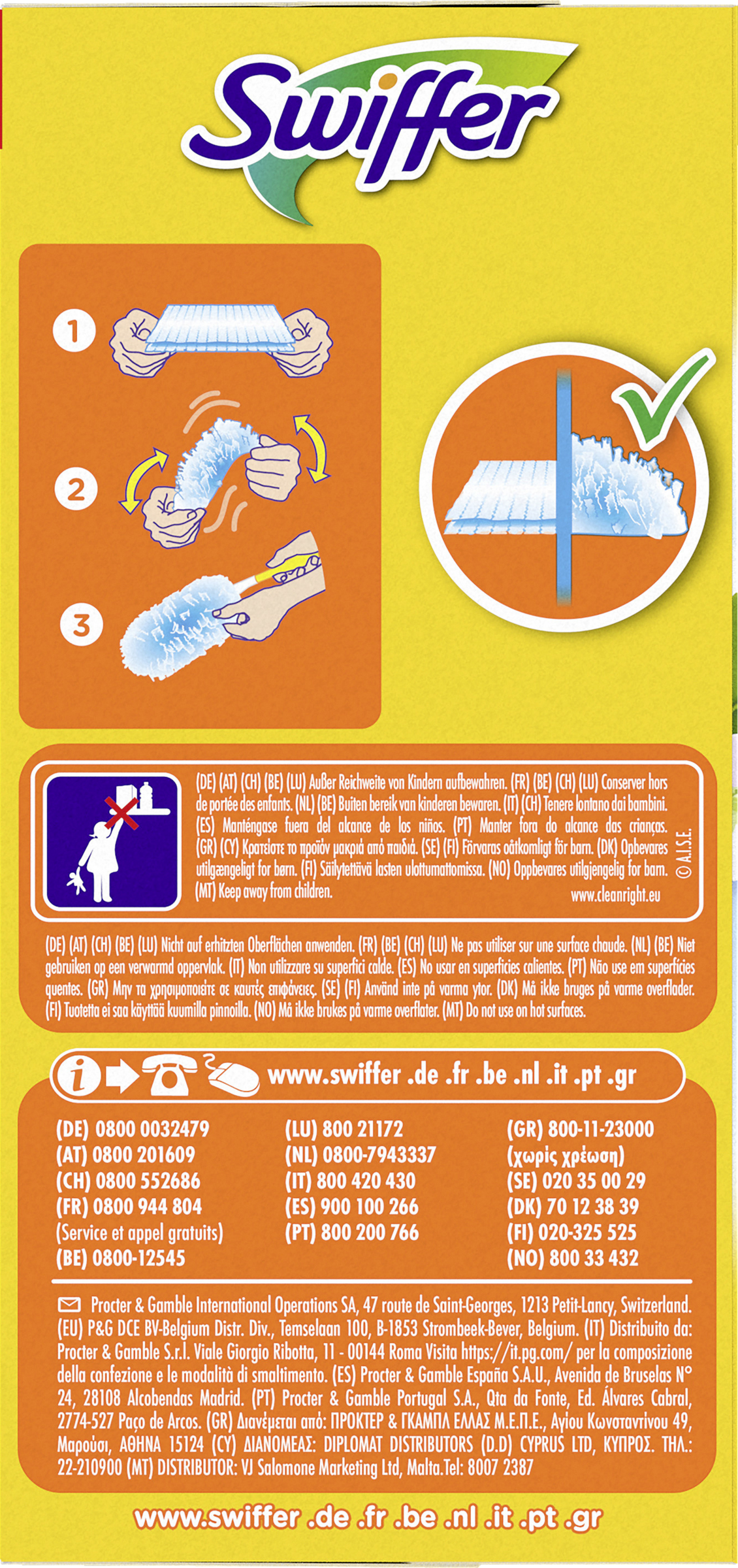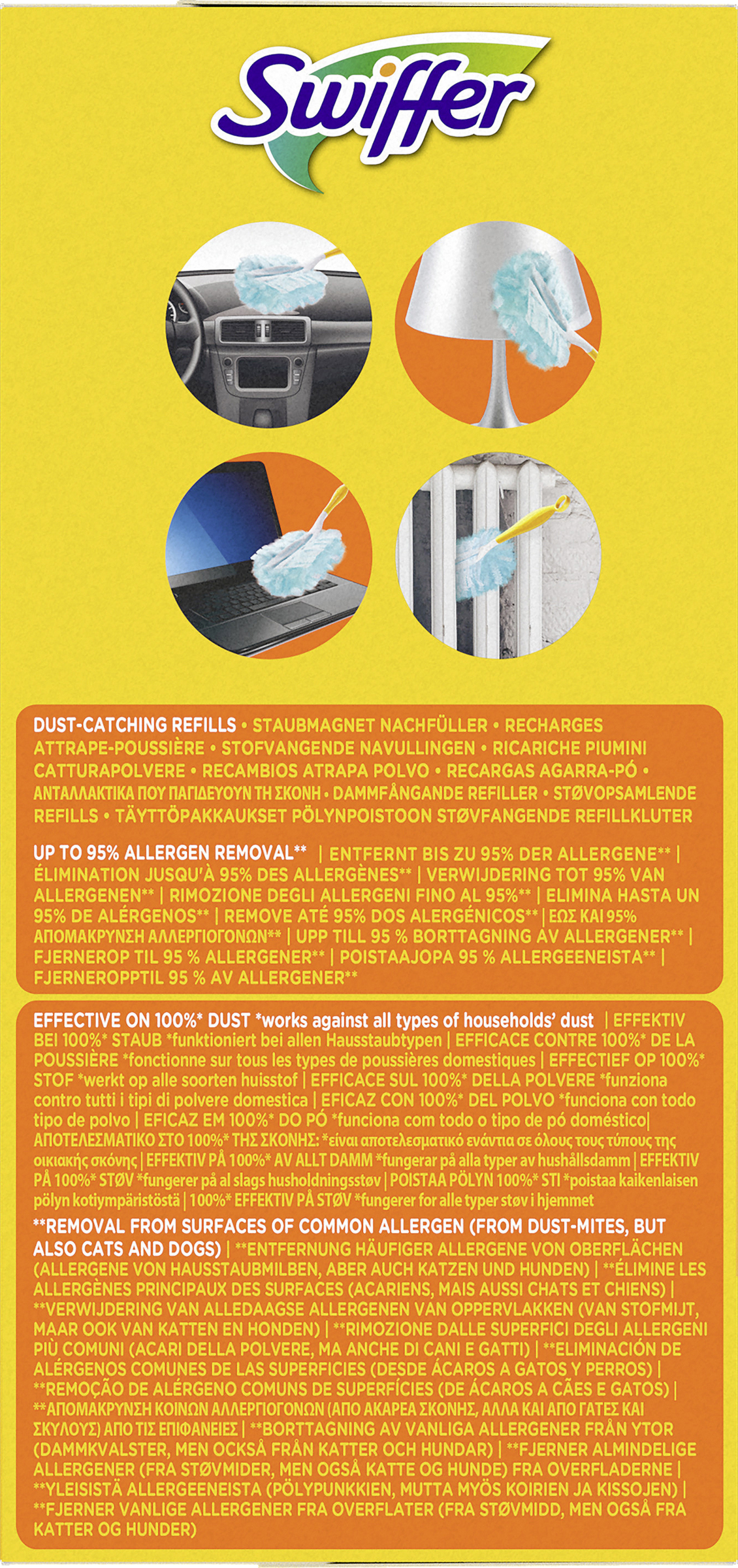 Swiffer Staubmagnet Nachfülltücher lassen dank ihrer Tausenden flauschigen Fasern, die Staub, Schmutz und Haare wie ein Magnet auf allen Oberflächen anziehen, Staub keine Chance (funktioniert bei allen Arten von Hausstaub) - das sogar an schwer zugänglichen Stellen und ohne ihn zu verteilen. Mit dem Swiffer Staubmagnet ist alles im Handumdrehen wieder sauber und Sie können sich von Staub, Schmutz und herumliegenden Haaren verabschieden. Sie werden nicht nur ein staubfreies Zuhause haben, sondern der Swiffer Staubmagnet hinterlässt auch eine langanhaltende Frische in der Luft für ein maximales Reinigungsvergnügen. Guter Tipp: Dieser eignet sich hervorragend zum Entfernen von Tierhaaren, die unsere Haustiere ständig verlieren, sowie für Hausstauballergiker. Mit Swiffer wird Staubwischen zum Vergnügen! Die Swiffer Staubmagnet Nachfülltücher sind sowohl mit dem kurzen als auch mit dem XXL-Griff kompatibel.