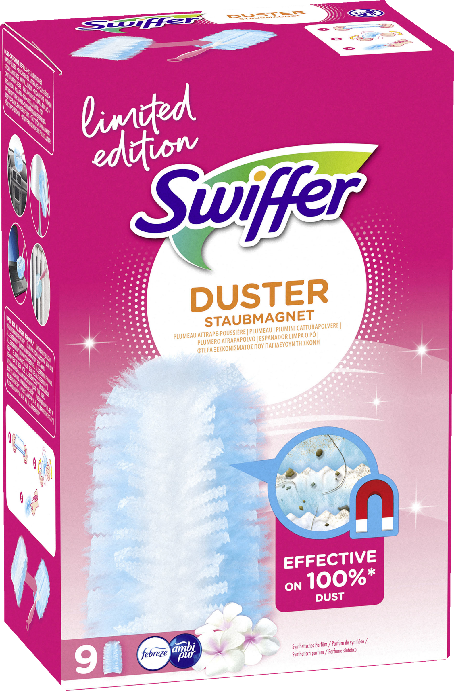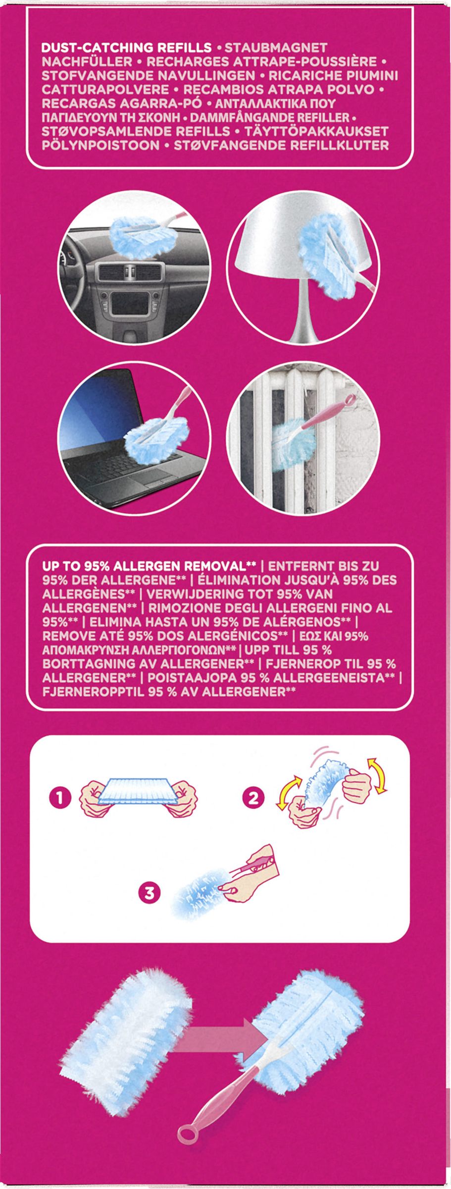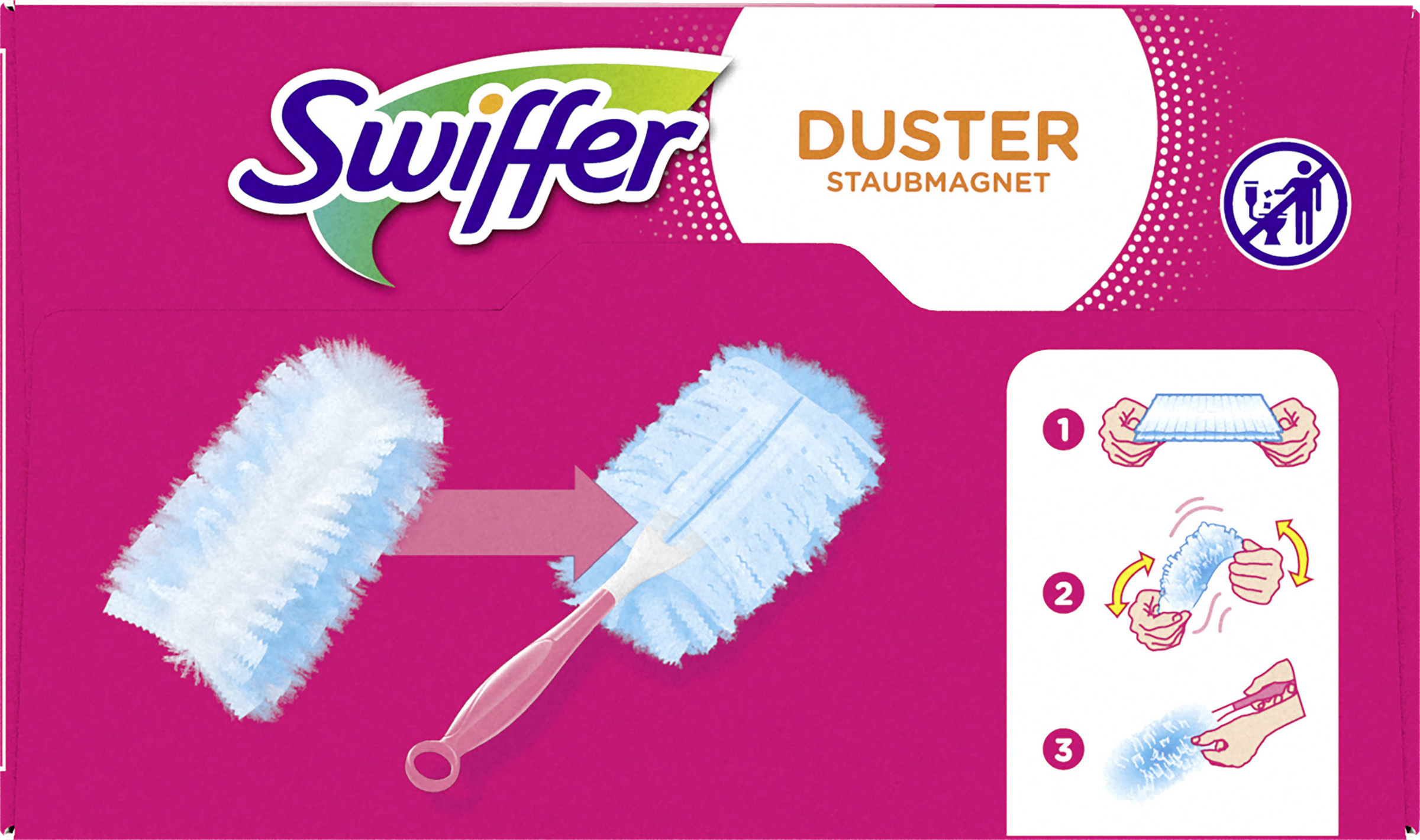 Swiffer Staubmagnet Nachfülltücher lassen dank ihrer Tausenden flauschigen Fasern, die Staub, Schmutz und Haare wie ein Magnet auf allen Oberflächen anziehen, Staub keine Chance (funktioniert bei allen Arten von Hausstaub) - das sogar an schwer zugänglichen Stellen und ohne ihn zu verteilen. Schütteln Sie einfach Ihren Swiffer Staubmagneten auf und schon kann das Putzen weitergehen! Mit Swiffer wird Staubwischen zum Vergnügen! Die Swiffer Staubmagnet Nachfülltücher sind sowohl mit dem kurzen als auch mit dem XXL-Griff kompatibel.