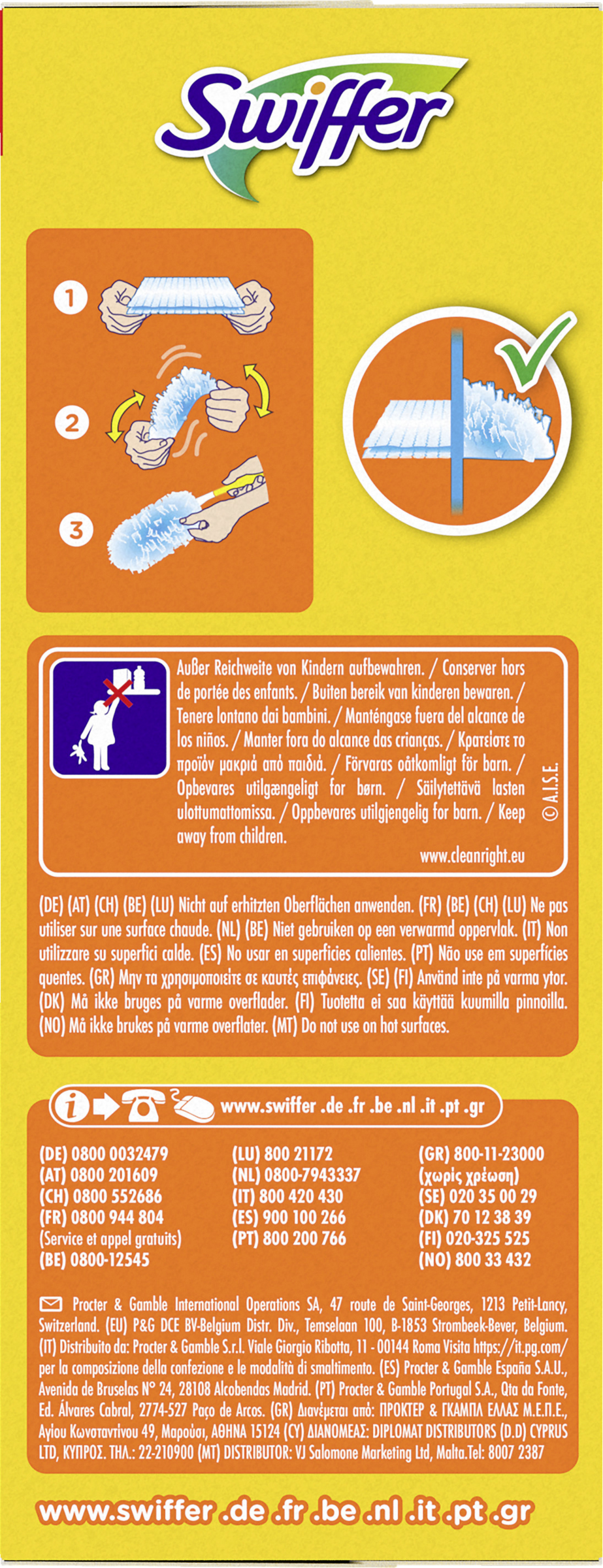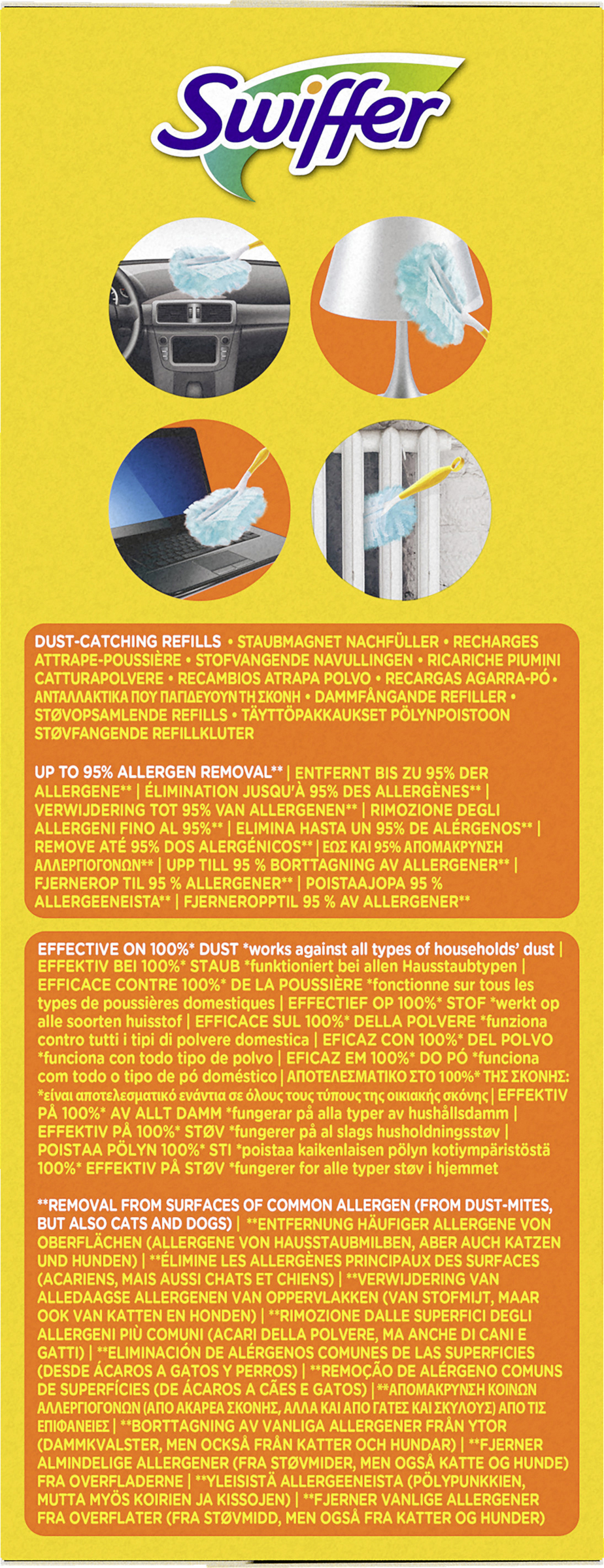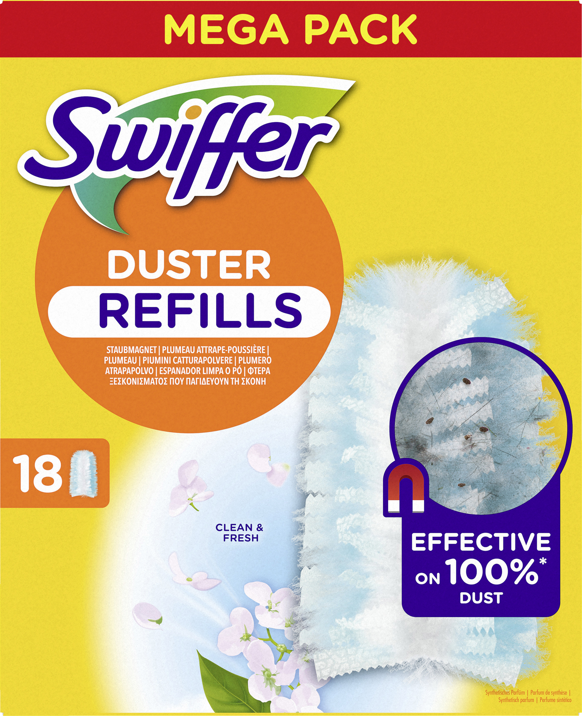 Swiffer Staubmagnet Nachfülltücher lassen dank ihrer Tausenden flauschigen Fasern, die Staub, Schmutz und Haare wie ein Magnet auf allen Oberflächen anziehen, Staub keine Chance (funktioniert bei allen Arten von Hausstaub) - das sogar an schwer zugänglichen Stellen und ohne ihn zu verteilen. Mit dem Swiffer Staubmagnet ist alles im Handumdrehen wieder sauber und Sie können sich von Staub, Schmutz und herumliegenden Haaren verabschieden. Sie werden nicht nur ein staubfreies Zuhause haben, sondern der Swiffer Staubmagnet hinterlässt auch eine langanhaltende Frische in der Luft für ein maximales Reinigungsvergnügen. Guter Tipp: Dieser eignet sich hervorragend zum Entfernen von Tierhaaren, die unsere Haustiere ständig verlieren, sowie für Hausstauballergiker. Mit Swiffer wird Staubwischen zum Vergnügen! Die Swiffer Staubmagnet Nachfülltücher sind sowohl mit dem kurzen als auch mit dem XXL-Griff kompatibel.